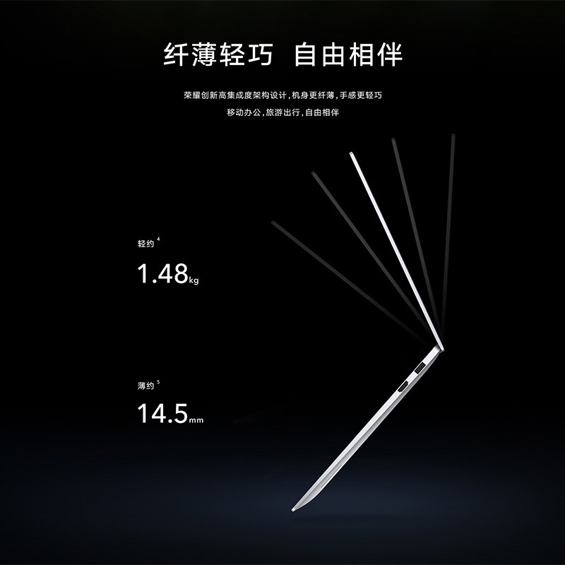 荣耀MagicBook V 14集显版最高搭载酷睿i7-11390H处理器,采用全新10nm SuperFin制程工艺,单核睿频最高5GHz,搭载了英特尔锐矩 X Graphics集成显卡,充分满足日常影音娱乐和图形处理需求。外观方面采用了航空级铝合金材料,经过23道复杂工艺匠心打造,坚固强韧,温润如玉。创新高集成度架构设计,轻至1.48kg,薄约14.5mm,移动办公,旅游出行,自由相伴。