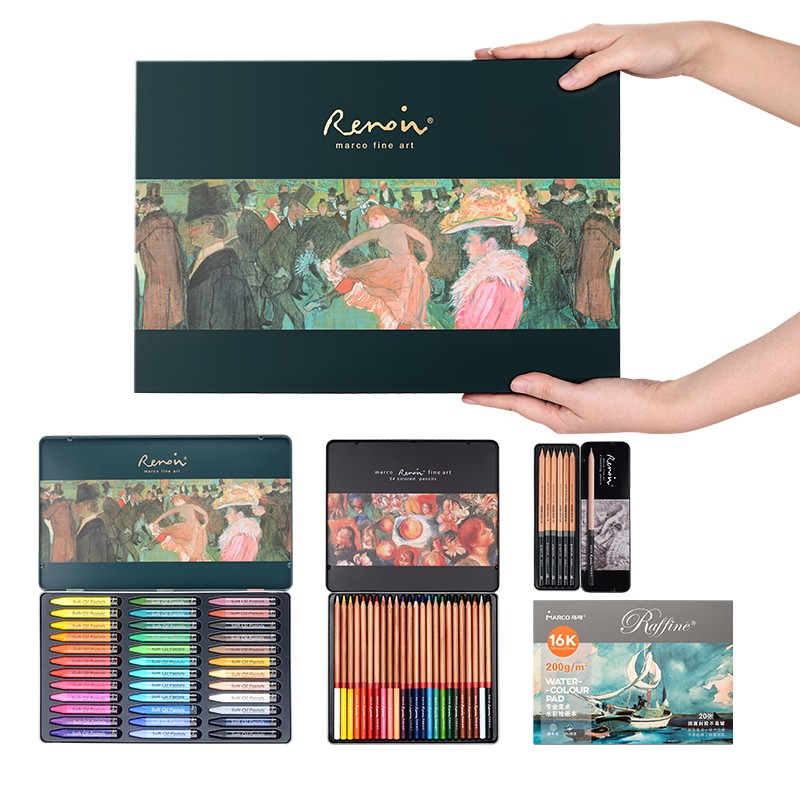 马可进阶绘画套装,此款礼盒内含36色重彩油画棒+24色彩铅+6支素描铅笔+绘图本。重彩油画棒,属雷诺阿系列新品,适合专业美术领域。颜色鲜艳浓郁,手感顺滑。质地醇厚柔软,油画般质感。覆盖力极佳,易叠色和混色。肌理感丰富,可展现多种技法(平涂、渐变、混色、点彩、叠色、刮画等)。雷诺阿油性彩色铅笔,色彩纯正,适用于大面积涂色。油性彩铅不溶于水,线条细腻,易于叠色,实现鲜艳写实的色彩效果。雷诺阿3001系列素描铅笔,采用美国雪松笔杆,铅芯纯净无杂质,8B-2H多灰度套装,进阶绘画之选。