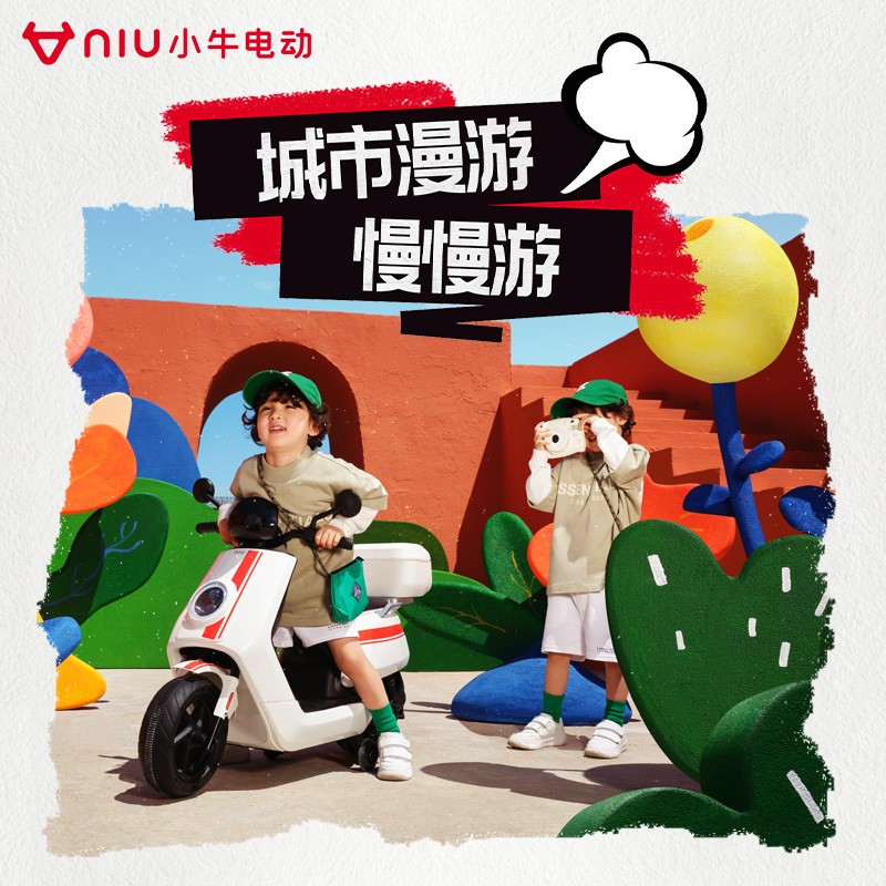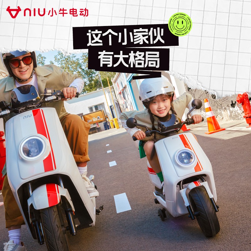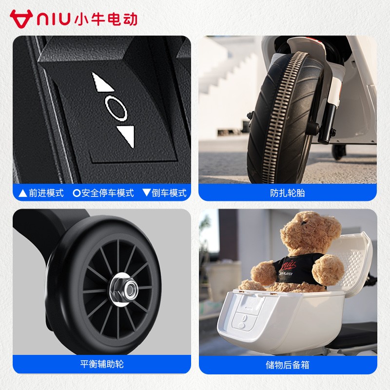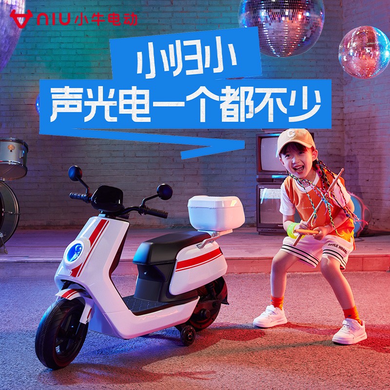 Niu Technologies 小牛电动 儿童电动车 采用12V4.5AH铅酸电池,时速5公里每小时,车身采用高强度金属车架搭配PP坚硬外壳,载重限80kg。并配有内置音乐和氛围灯光,外加USB、SD卡外部双接口。前进、停车、倒车三个档位,两侧配有辅助轮,让行车更安全,长1100mm,宽423mm,四种颜色,前进,后退,停车三种模式,适合3岁以上小朋友,续航90分钟,整车11kg。