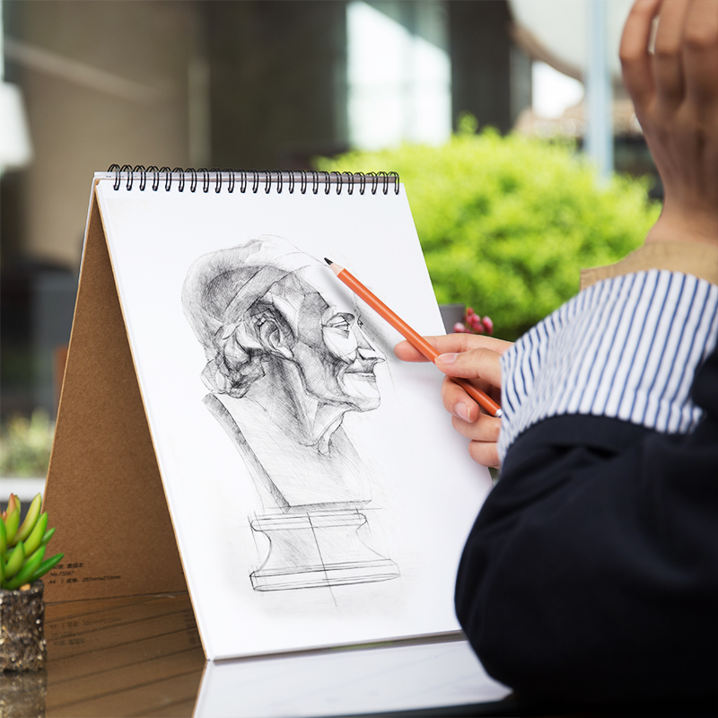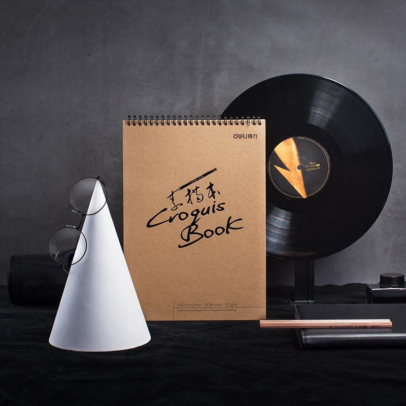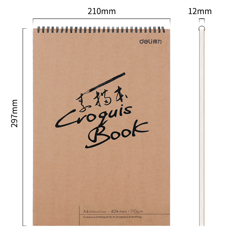 得力出品的素描本,规格为A4大尺寸,这款为双金属线圈装订,厚实牛皮纸板封面,内页为110g加厚素描纸,肌理清晰耐擦耐磨,易上铅,适合外出携带或手绘使用,加厚型封面无需借助画板即可使用。