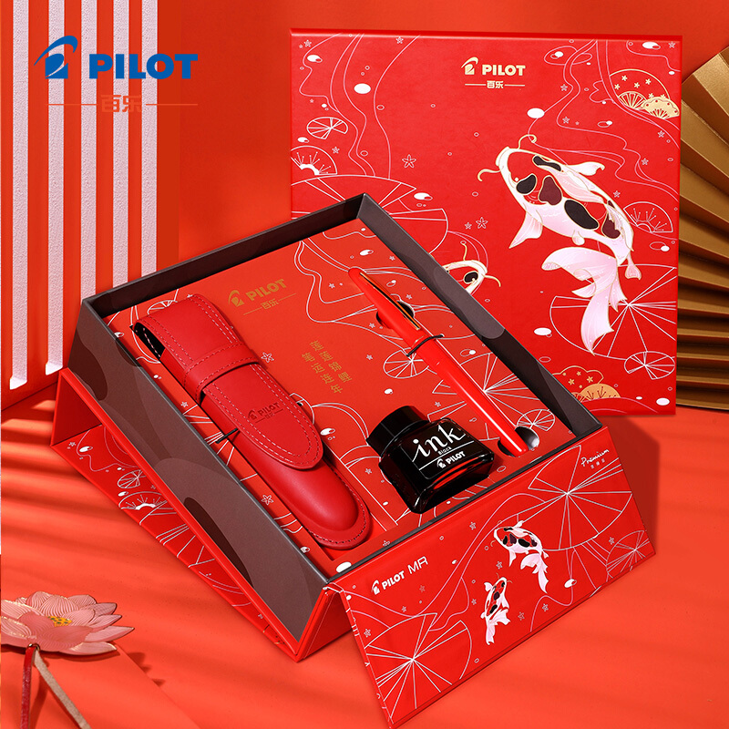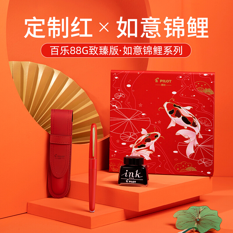 PILOT百乐如意锦鲤88G钢笔F尖礼盒装,特殊合金不锈钢定制金色笔尖,触感细腻,书写流畅;树脂材质笔握,握感舒适,适合长时间书写;拔帽式笔盖,保护笔尖,笔盖里有4个卡口,合上后不易脱落,能有效保护笔尖。
