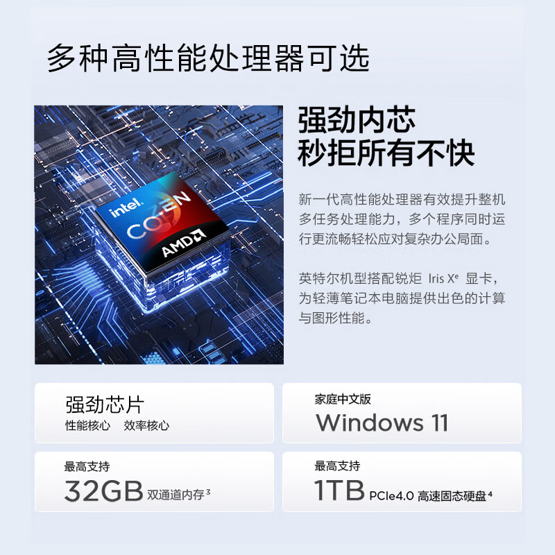 配置方面,AMD 锐龙 R5-5650U处理器,搭载 16GB DDR4 3200MHz 内存,512GB SSD M.2 PCIe 固态硬盘,最高可选1TB。