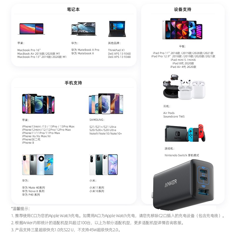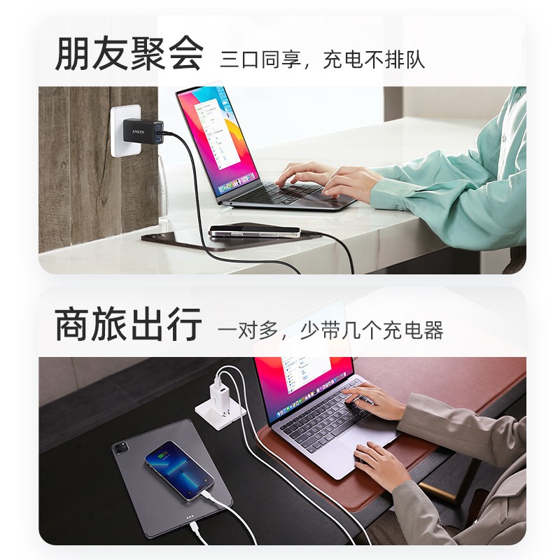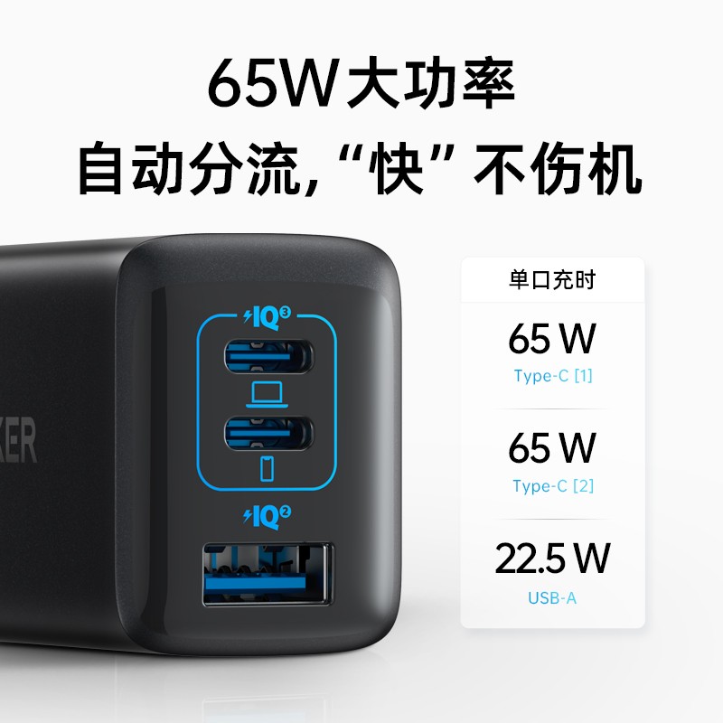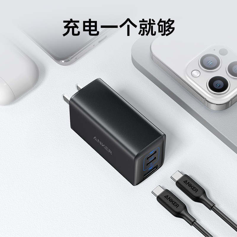 Anker 65W三口充电套装,2C1A,插脚可折叠,配Typer-C快充线一米。兼容多设备快充手机/笔记本,居家旅行差旅一个就够。支持PPS协议,智能降低发热。尺寸:66.3*29.1*38.6mm,mini小巧,方便携带。45分钟可以为Macbook Pro13充满50%。