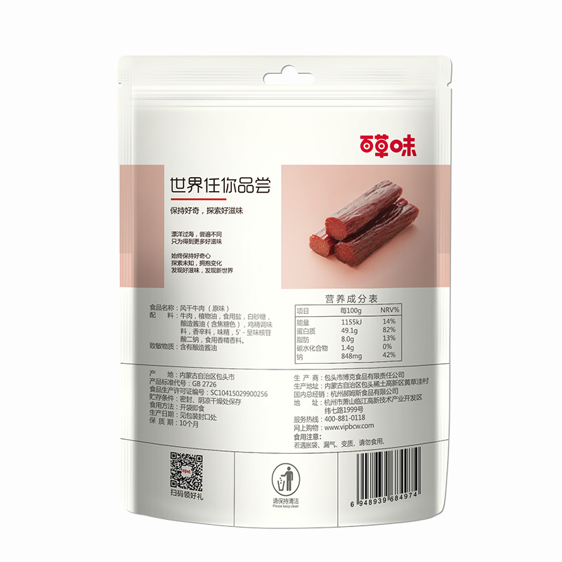 百草味(Be&Cheery)的这款原味风干牛肉,采用控温长时间卤制后油炸的方式,呈现牛肉醇香。颜色红润油亮,肉质紧实细致,纹理清晰,牛肉鲜嫩不柴。袋装包装,内置封口条设计,防潮防漏,即开即食。保质期12个月,建议置于阴凉干燥处储存。规格:50g