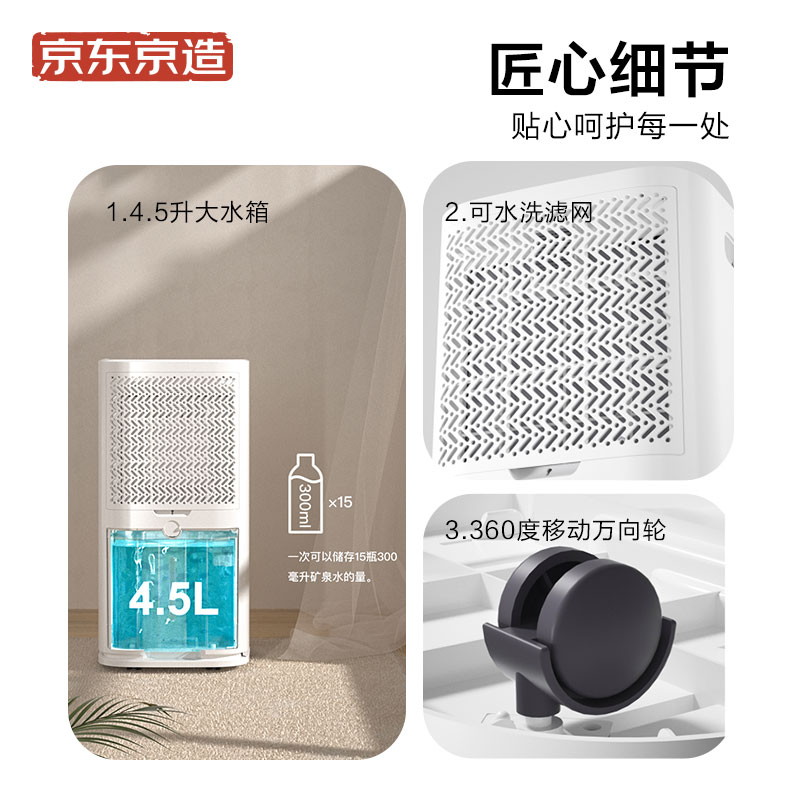 京造这款型号为JZ-CSJ24L的除湿机,最大可适用120㎡空间,搭载松下原装直流压缩机,除湿量可达24升每天,效果强劲,结合内置的环境传感器,实现精准控制,360°环绕送风,除湿更加均匀,搭载负离子净化技术,室内空气更加清新,还具有一定的除菌效果,4.5升大水箱,免去频繁换水烦恼。