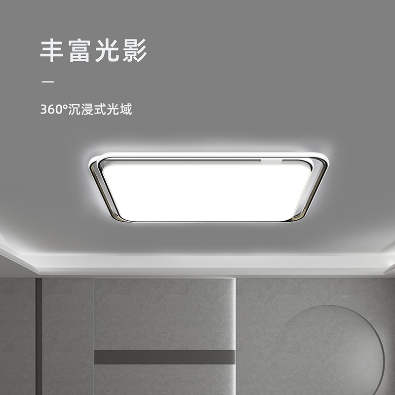 此款吸顶灯采用几何美学设计,沉浸式光域,多层光影展现;整灯尺寸超1米,超大发光面。纤薄设计,轻盈时尚。可以调光调色,具有多种预设场景+记忆功能。