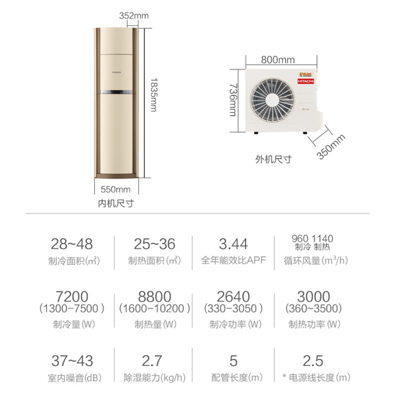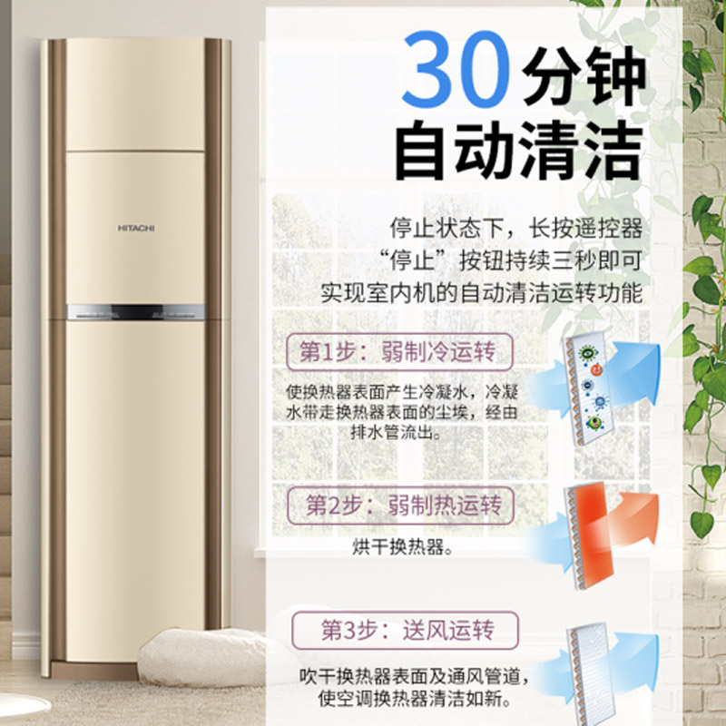 日立Y系列柜机,金色外观,采用R410a冷媒,全直流变频系统,运行更佳稳定,实现快速冷暖。进口主控芯片,优化运行,节能高效。支持自清洁,30分钟清洁热交换器,保障呼吸健康。变频矢量PAM技术,最大限度发挥电流利用率。不锈钢滤网,更佳便于清洁。上下左右送风,使用舒适。室外机采用热镀锌港版,精致喷漆,防锈处理,小巧便于安装。