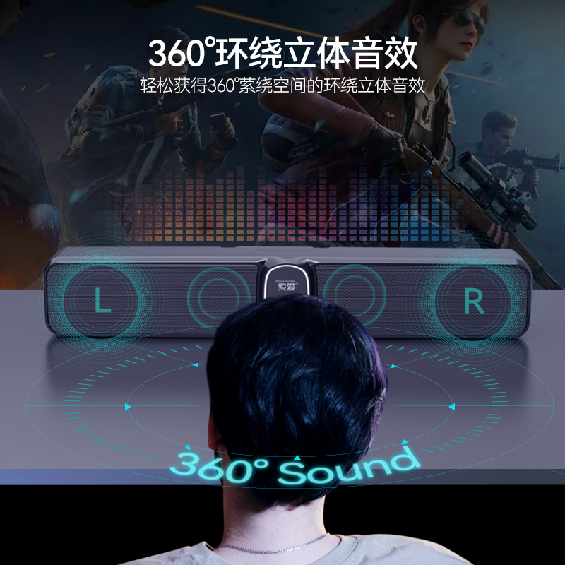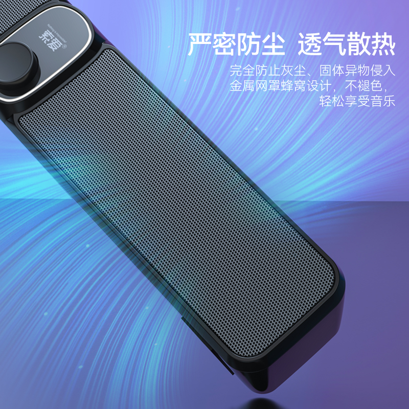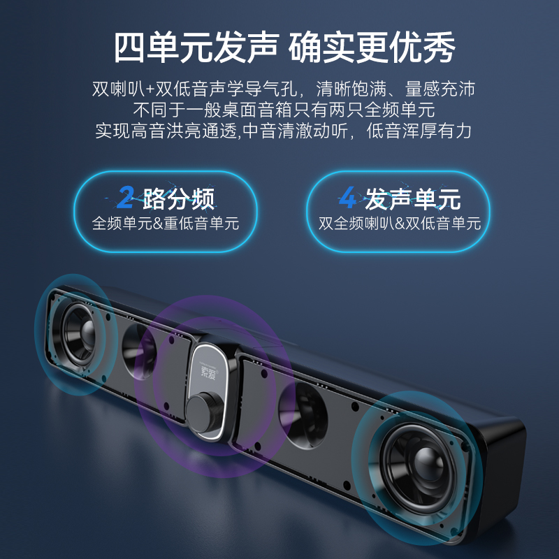 双喇叭四单元发声,定制52mm大尺寸全频喇叭,蜂窝防尘散热,支持多种设备播放。