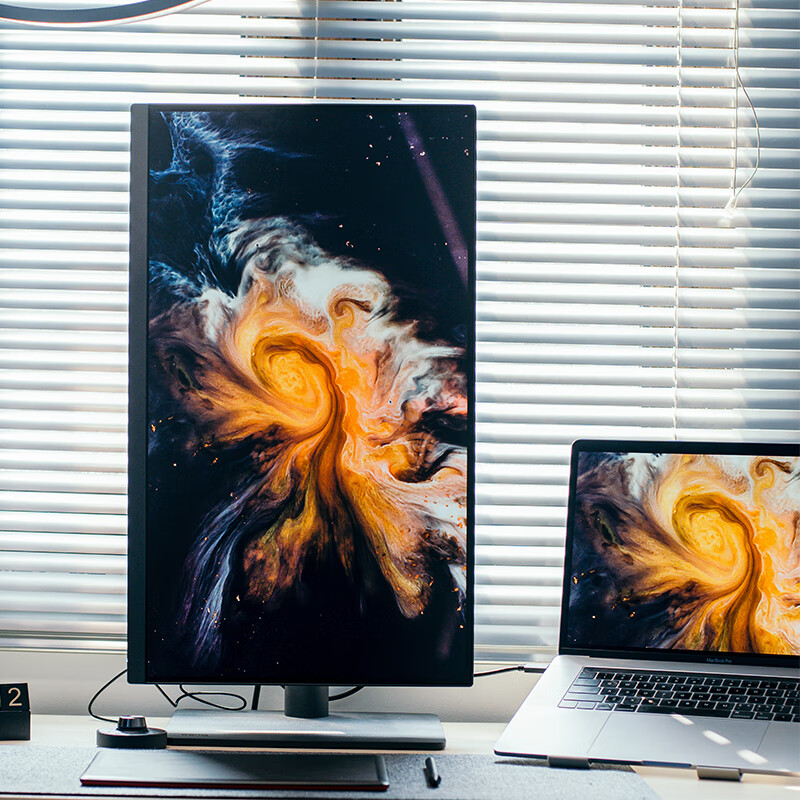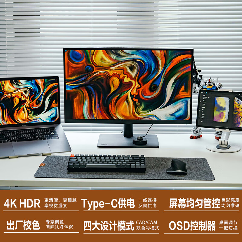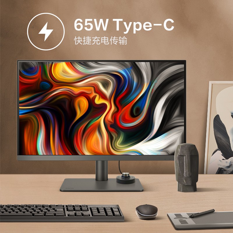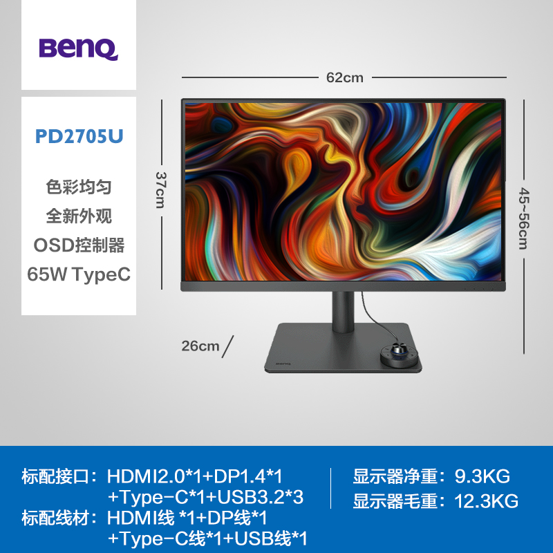 明基PD2705U专业显示器,采用27英寸4K IPS 10-bit面板,拥有10.7亿色、99%sRGB、Re .709色彩、出厂经过专业校色,采用亮度色温均匀技术,出厂时将屏幕分为25个区域单独校对每个区域,实现屏幕各处色彩准确统一、此外,该显示器有着四大专业设计模式,支持65W Type-C充电与M-Book模式。 外观方面,全新外观,一根圆柱稳固支撑,转动你的工作屏,尽显专业风范,此外附带全新外接控制器,支持旋钮自由调节亮度、对比度、音量、自定义按键实现色彩模式、 PBP 、 KVM 、静音、信号源一键切换。 其他方面,有四种低蓝光模式与智慧爱眼功能,内置2.5W双音响,支持VESA壁挂。