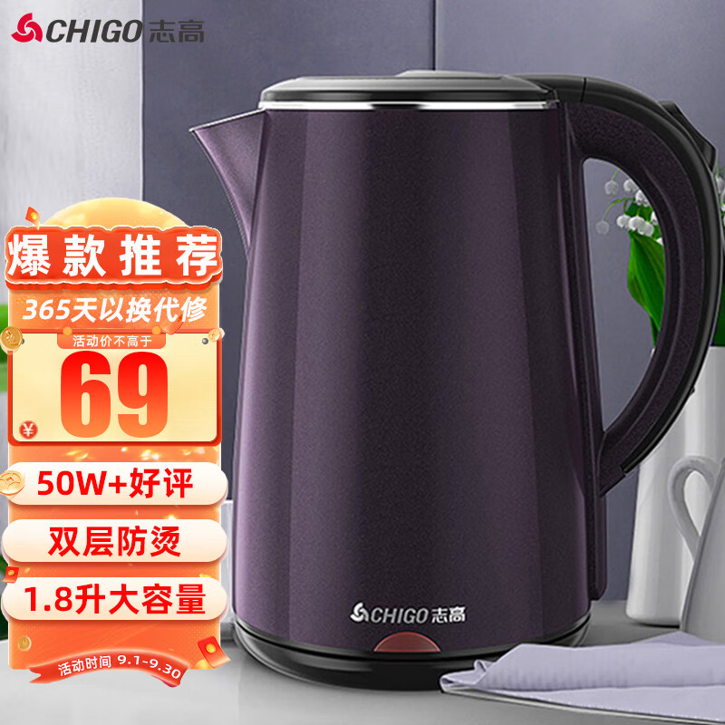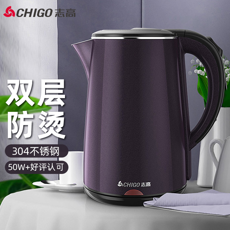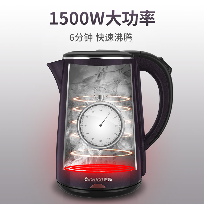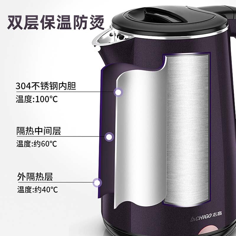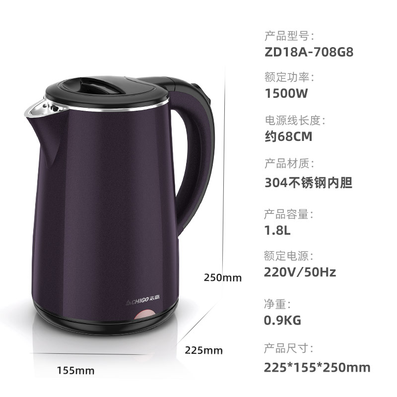 CHIGO 志高,品牌隶属于广东志高空调有限公司,创建于1994年,位于珠江三角洲工业重镇佛山市南海,是一家以空调起家的公司,后来产品系列拓展到家用厨电领域,这款CHIGO 志高 ZD18A-708G8电热水壶,304不锈钢材质,双层设计,保温防烫,容量为1.8L。