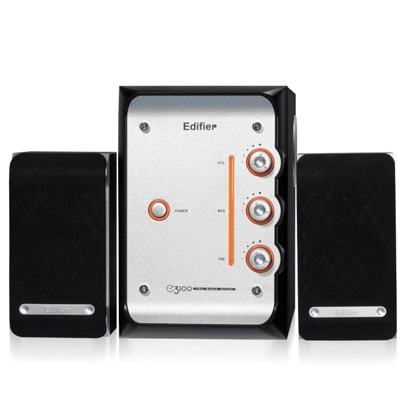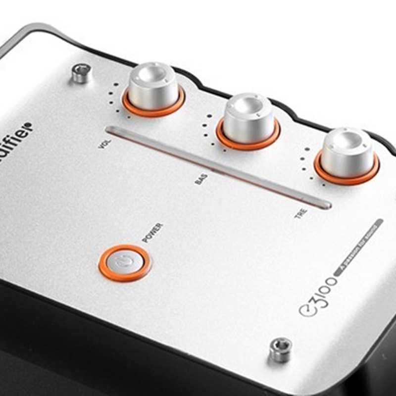 漫步者E3100是漫步者时尚E系列的第一款音箱,黑色箱体搭配金属色面板,再加以橙色旋钮镶边,双曲面倒相孔设计配合嵌入式全铝面板,给人感觉时尚富有活力,箱体右侧三个旋钮突起,可以方便的调控音量和高低音,旋钮旁的橙色导光带与旋钮外圈交相呼应,使音响整体显得超凡脱俗。