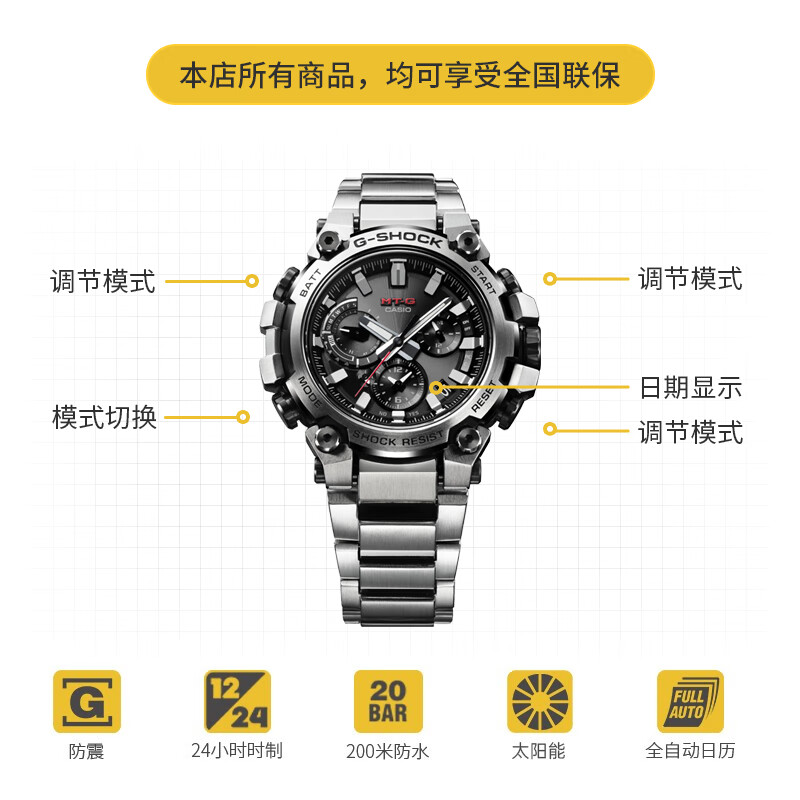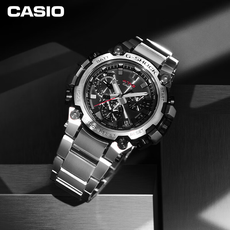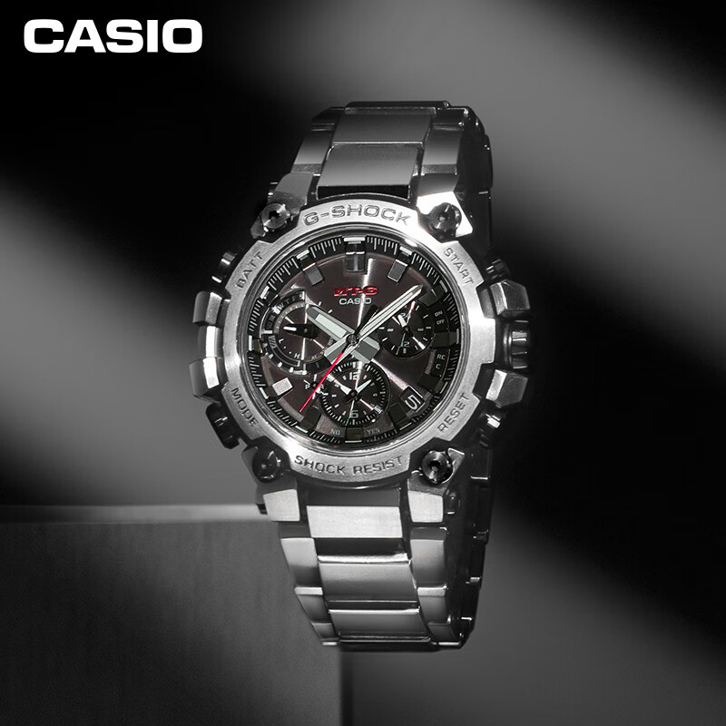 此款产品为CASIO 卡西欧 G-SHOCK MTG-B3000高端系列 MTG-B3000D-1APR,双重核心防护构造,蓝牙连接功能,太阳能动力,6局电波计时。高亮度LED照明,人造蓝宝石玻璃镜面,碳纤核心防护构造,表圈黑色P涂层,经过金属拉丝抛光处理折射银色质感光泽,呈现不凡气场金属表身刚韧并济,以时尚格调态度展现进化之姿。