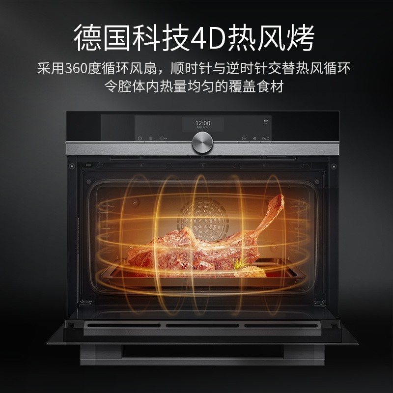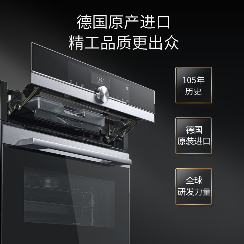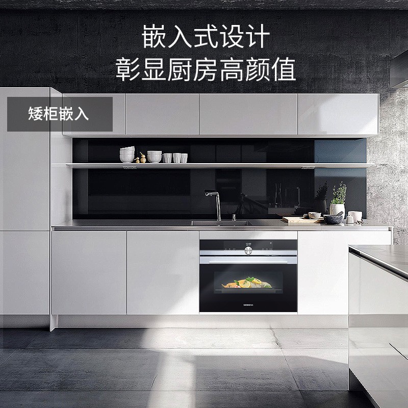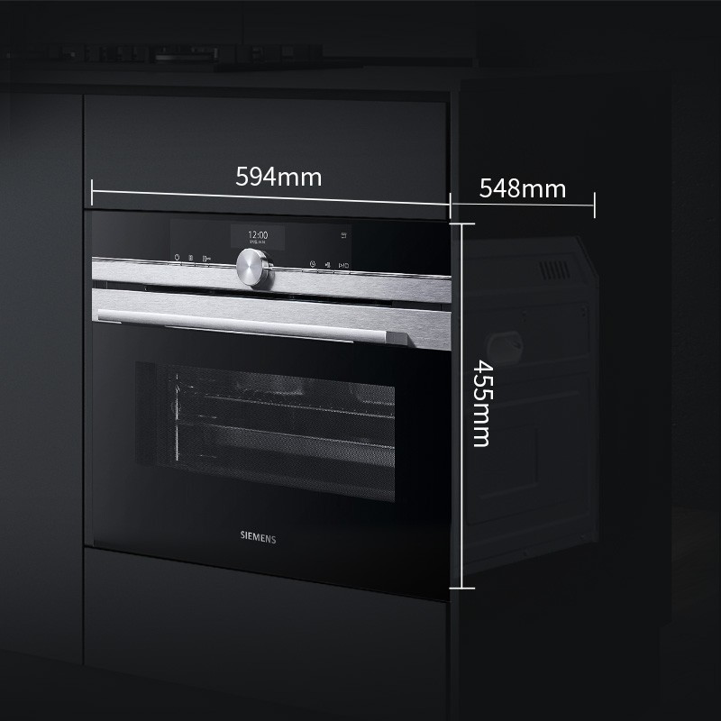 西门子CS636GBS1W蒸烤一体机,容量为47L,支持纯蒸、纯烤和蒸汽辅助烤模式,采用360度循环风扇,顺时针与逆时针交替热风循环,使热量均匀覆盖食材;支持亚沸锁鲜蒸,快速升温产生大量食材包裹食材,结合智能算法将温度稳定保持在95℃,另外无冷凝蒸制更好保护食材的鲜嫩口感;内腔为进口珐琅材质,背板采用特殊涂层,可以高温碳化残留污渍,一擦即净;外形尺寸(高*宽*深)为455*594*548mm。