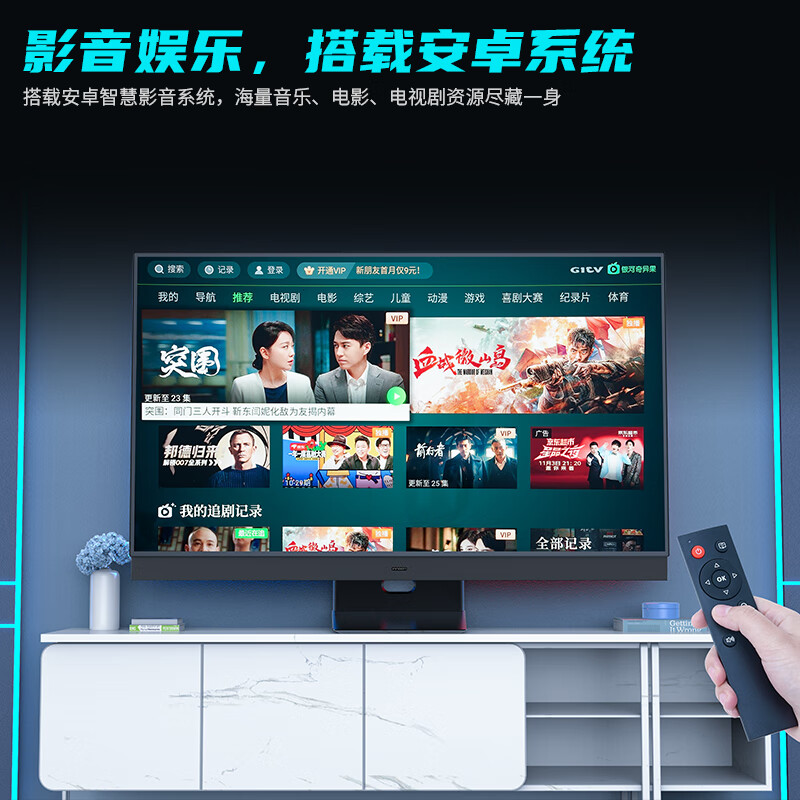 自带底座支持高度调整及俯仰角度调整,满足不同场景使用;两侧七彩LED律动灯,随着画面颜色变化,还支持VESA壁挂和机械臂连接。