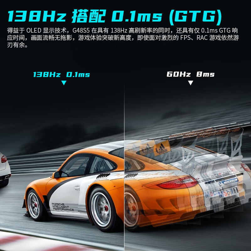 显示器采用OLED面板,3840×2160刷新率,138Hz高刷新率,支持HDR400,静态对比度达到了惊人的135000:1,700尼特峰值亮度,内置20W低音单元加双10W中高音单元组成2.1声道,打造浑厚饱满好音质,方便玩家听声辨位、捕捉游戏中的风吹草动。
