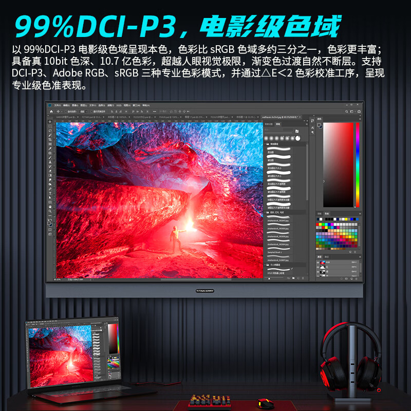 以99%DCI-P3电影级色域呈现本色,色彩比sRGB 色域多约三分之一,色彩更丰富,具备真10bt色深、10.7亿色彩。支持DCI-P3、Adobe RGB、sRGB三种专业色彩模式,并通过△E<2色彩校准工序,呈现专业级色准表现。为NVIDIA及AMD显卡准备的Adaptive-Sync自适应垂直同步技术,能够将显示器刷新率与显卡输出信号保持同步,带来流畅无撕裂的游戏画面。
