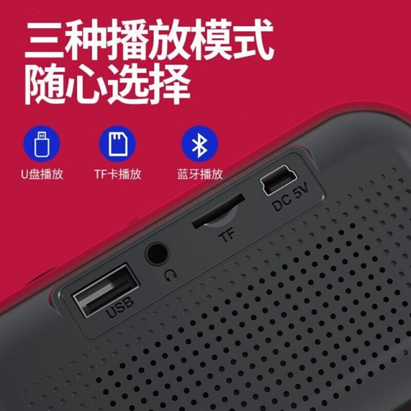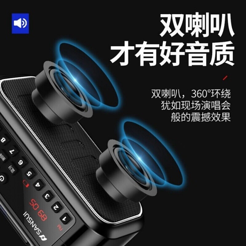 双喇叭,360°环绕,犹如现场,演唱会般的震撼效果。独立低音振膜,配合双喇叭,让低音震撼,高音明亮。内置1800MA大容量锂电池,持续听歌约8小时,待机约200小时。内置FM收音功能,流行音乐、新闻、天气、搞笑段子、随心切换,尽享更多乐趣。直接输入歌曲的编号,即可完成点歌,方便快捷。兼容市面上所有手机、平板、电脑等智能设备,连接更稳定,距离更远。