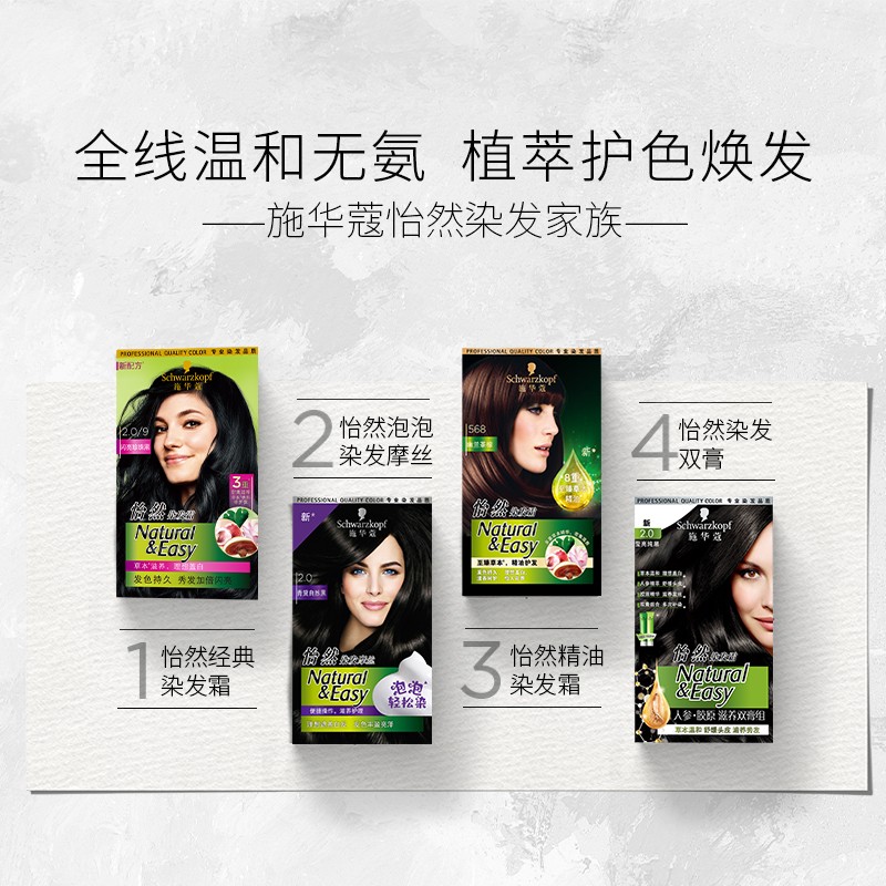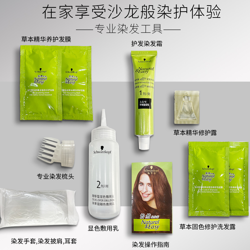 该套装包含染发霜、显色敷用乳、洗发乳、操作指南、手套。染发霜采用无氨的温和配方,含润发成分,从里至外润泽发丝,遮盖白发效果令人满意。蕴含天然荔枝精华及6种草本成份,可以深层滋养秀发,令秀发健康柔顺。另外施华蔻的染发霜有怡然和幻彩两个系列,怡然系列对发质伤害较小,适合遮白发;幻彩系列则漂亮一些且不易掉色,不过对发质伤害稍大。