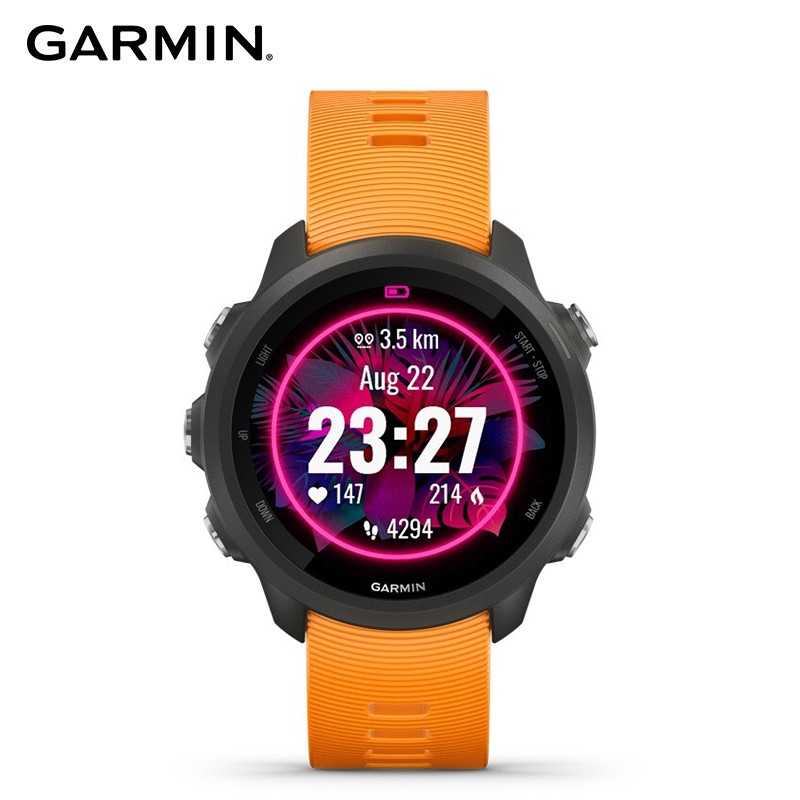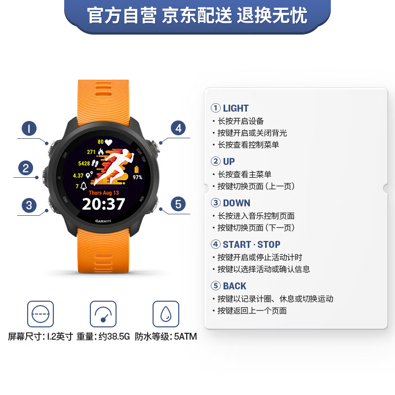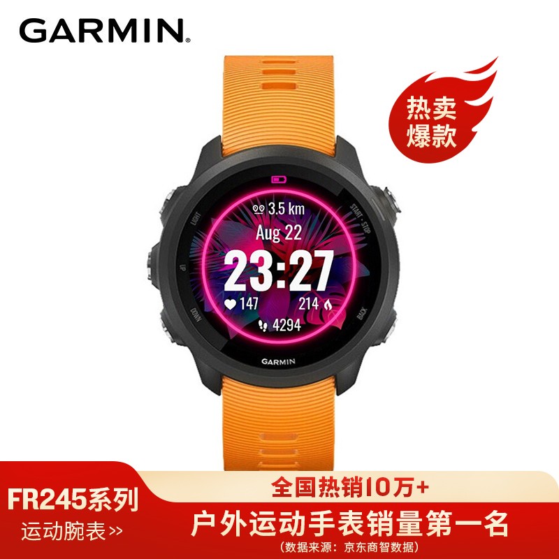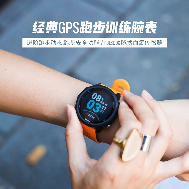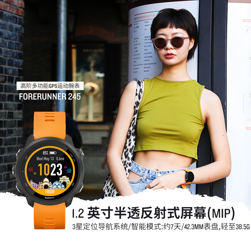 GARMIN 佳明 Forerunner245 多功能音乐手表采用多孔透气和快拆式硅胶表带,按键设计,运动时可避免误操作,康宁大猩猩玻璃,强度更高,无惧恶劣环境,轻量设计,重量仅38.5克,减少摆臂时的晃动,半透半反MIP显示屏,强光下仍清晰,运动时低功耗。
