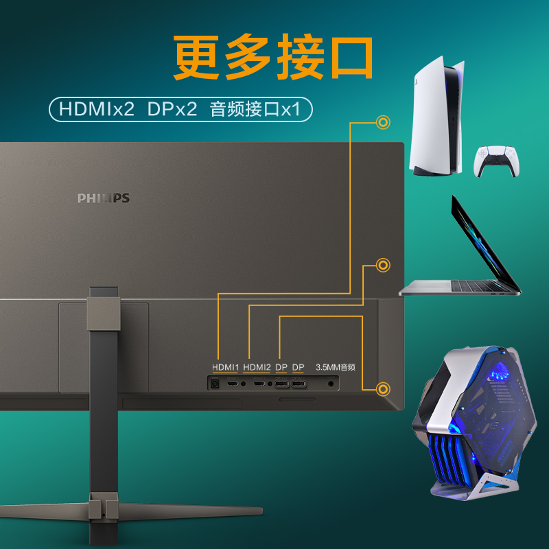 飞利浦猛腾M2系列电竞显示器支持升降多变造型,配备理线槽,屏幕采用34英寸IPS超宽电竞屏,分辨率为3440✖️1440,搭配超宽WQHD晶析图像,画面清晰锐利,21:9的宽高比,拥有300cd/m2亮度,178°广视角,内置144Hz超高刷新率,1ms疾速响应,有效减少动态卡顿、延迟与撕裂的问题。低输入延迟让画面动作疾速反映,减少从设备到显示器输入命令之间延迟时间,同时拥有119%sRGB拓宽色域空间和HDR10高动态范围技术。
