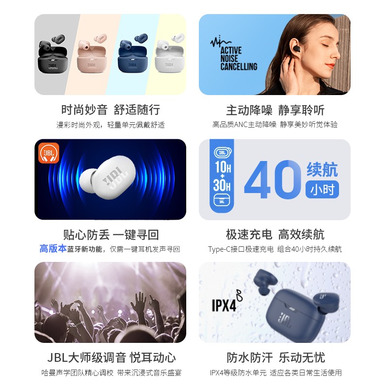 JBL TUNE 130NC TWS耳机拥有曜石黑、珍珠白、玫瑰色、深蓝色四种配色,支持高品质ANC主动降噪,静享美妙听觉体验,支持双击进入环境音模式,无需摘下耳机也可与他人交流;带有“双波束成型”技术,双麦克风降噪,通话如面,通话更清晰;开启ANC续航单耳机约8小时,耳机仓可提供24小时续航时间,关闭ANC单耳机续航可达10小时,耳机仓可提供30小时额为续航;拥有JBL纯正低频特效,大师级调音,低音澎湃;耳机采用人体工学设计,稳定佩戴舒适贴耳,长时间佩戴也不会感到疲劳;IPX4级防水防汗,让你的耳机成为多面手;耳机支持腾讯小微语音助手,轻按3秒,即可召唤;支持JBL耳机APP自定义音效,让你的耳机更适合你。