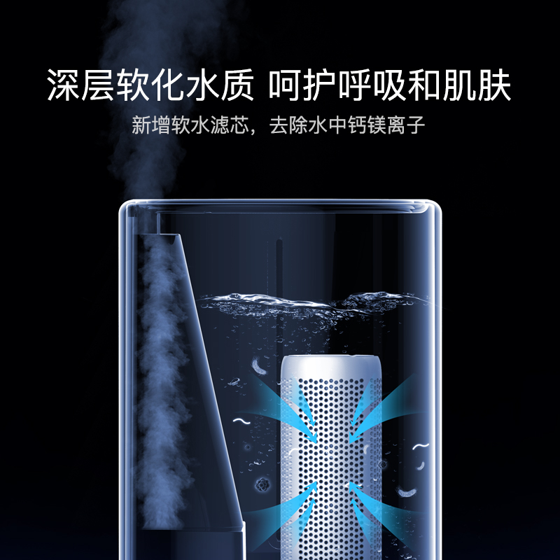 米家智能除菌加湿器S,采用新型高效雾化片,带来450mL/h大雾量;底座水路杀菌区的UV-C紫外线,可以充分照射每一滴水,实现99.9%杀菌率;内置软水树脂滤芯,可以释放阳离子与水中的钙镁离子进行只换,降低钙镁离子含量,减少水雾蒸发后的白色粉末污染;通过改进风道结构,高速涡轮风扇带来70cm水雾柱,“天幕”高雾滋润全屋;支持过湿保护,在3档雾量加湿状态下,当相对湿度>70%已经持续1小时后,自动调至1档;支持APP/语音操控,40%RH-70%RH可调;水箱容量4.5L,采用上加水设计。