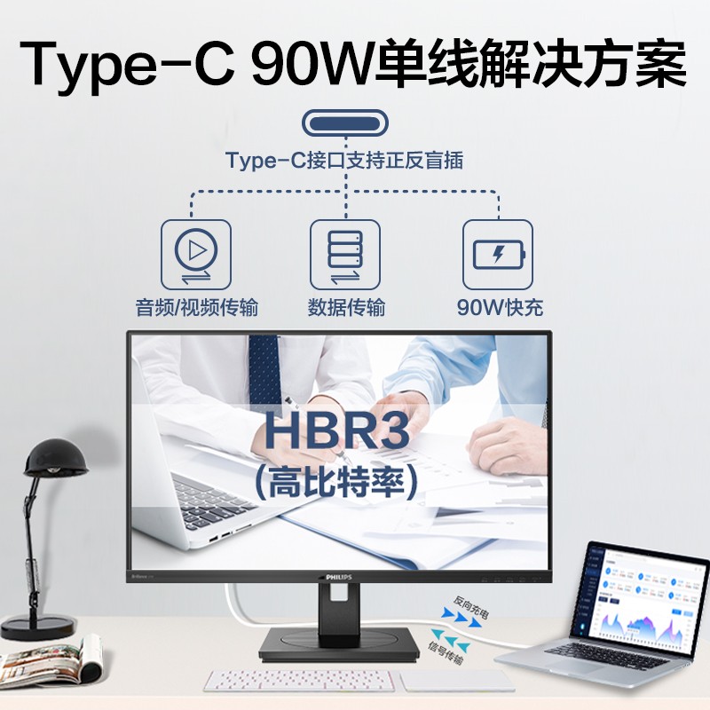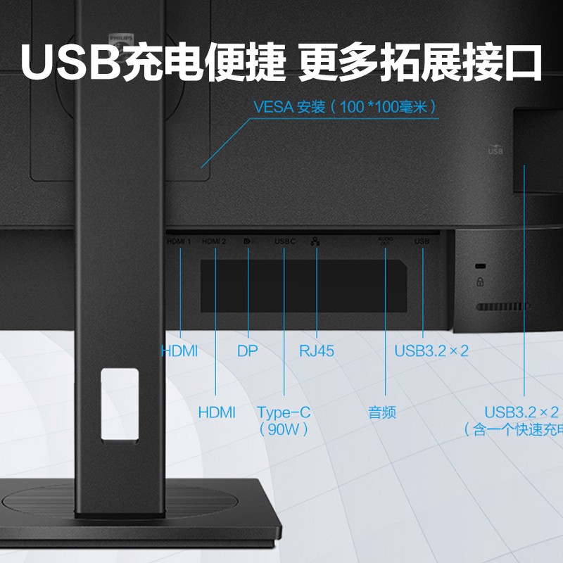 搭载Type-C 90W 供电口,一条线传输(4K视频、音频、USB数据、数据及供电)。另外HDMI*2、PD*1、RJ45*1、音频接口、USB3.2*4(含一个快速充电)。内置音箱,3W扬声器*2.采用升降旋转底座,支持多角度调节,