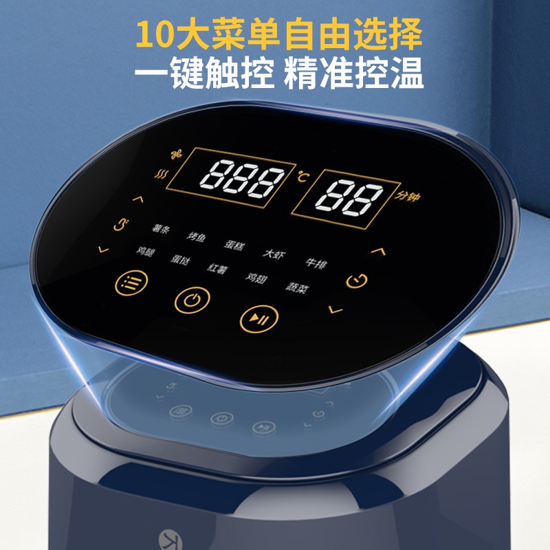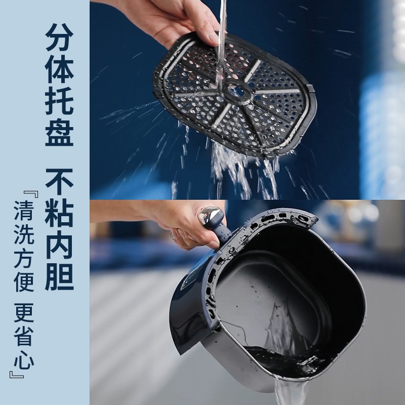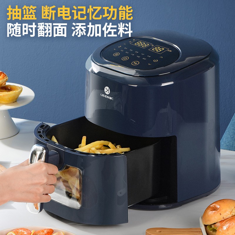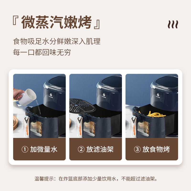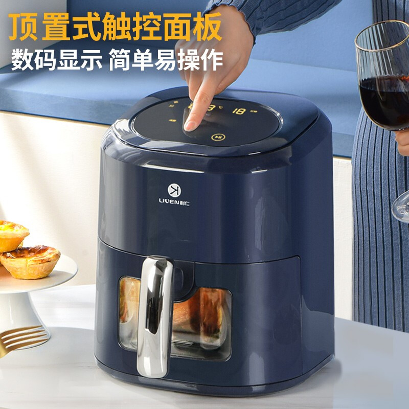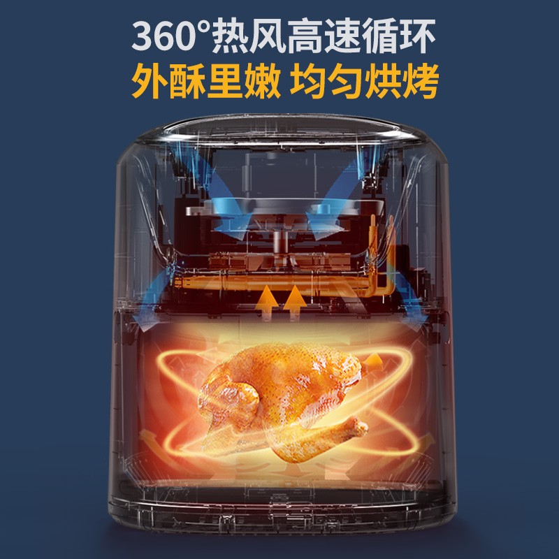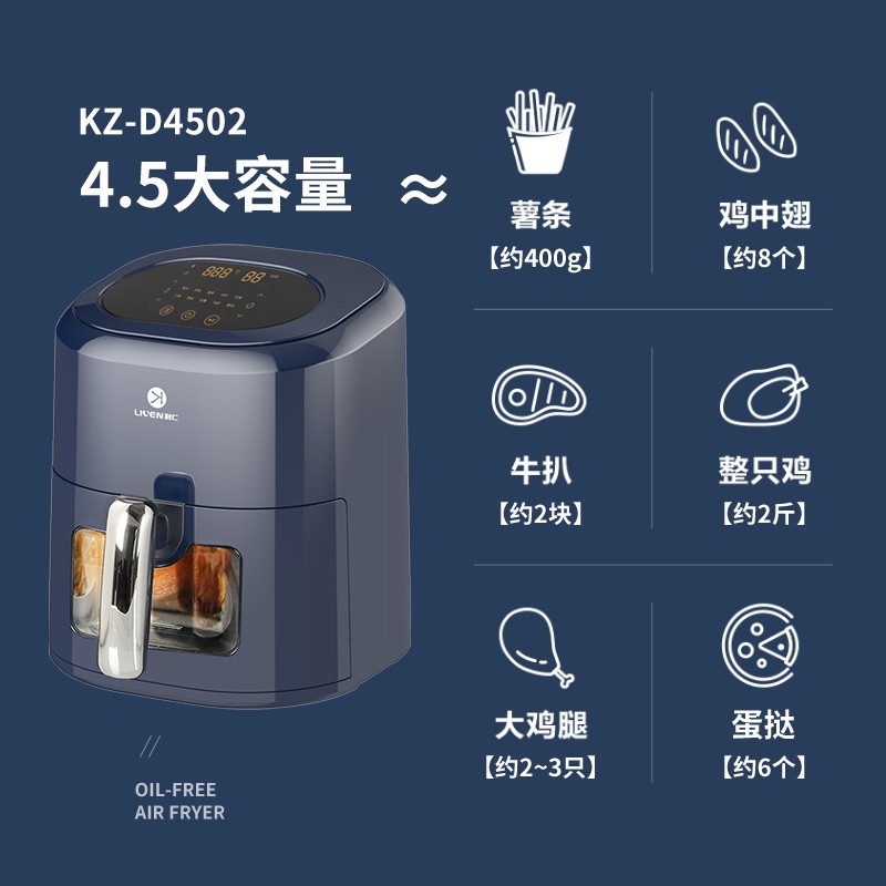 热空气加热,少油脂,少油烟,搭配1200W大功率食物快速熟透脆化,4.5L大容量满足2-5人食用,荤素齐全多种选择难以抗拒的回家诱惑,智能操作面板简单便捷方便耐用,可视窗口美味看得见,高温热风循环空气炸200°℃高温脱脂。