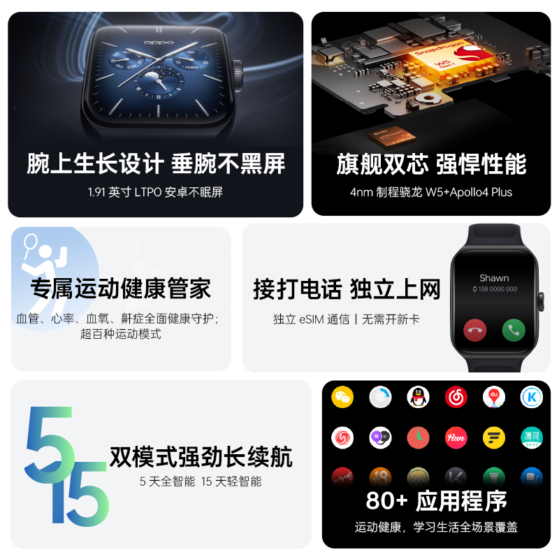 其他方面,OPPO Watch 3 Pro还配备了ECG心电传感器,支持血管健康研究功能,可实现 24 小时全天候心率监测、24 小时不规则心律监测、连续血氧监测、全场景睡眠守护,支持 GPS、NFC、独立 eSIM、蓝牙 5.0、5ATM 防水,搭载 ColorOS Watch 5.0 系统,提供上百种运动模式,拥有独家定制的网球模式,而且还新升级了跑步模式,还有机械振感旋转表冠等细节设计。
