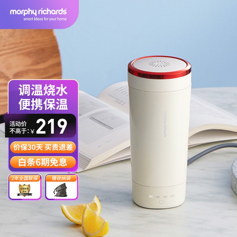 摩飞(MORPHY RICHARDS)这款300ml容量的便携电热水杯重量仅600g,轻巧且方便携带。盖上有70个花瓣透气孔可均匀泄压;杯盖封口处透气膜可自动排出膨胀气压,单向释压不漏水;底部NTC温控可实现±1°C精确控温,动态监测水温。四档温控设计,分别有100℃、80℃、55℃和40℃四档可选,满足不同使用需求。内胆采用食品级316不锈钢材质,耐腐蚀耐高温;外层则选用304不锈钢,双层杯身设计实现防烫。适用于100-240V电压设计,通用多国电压。