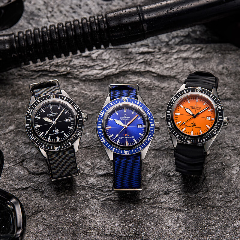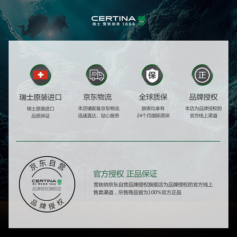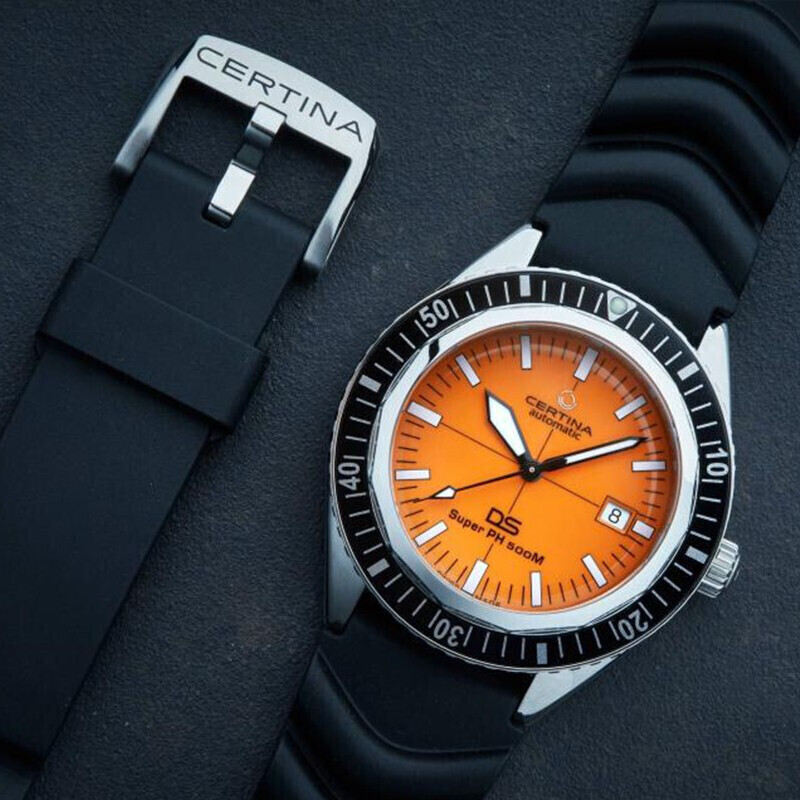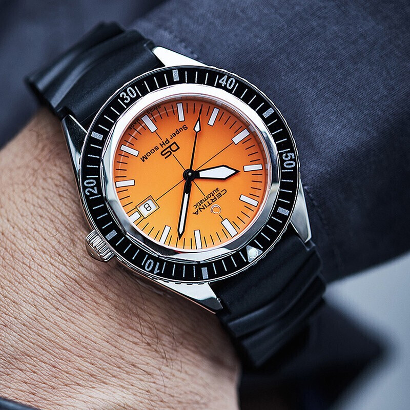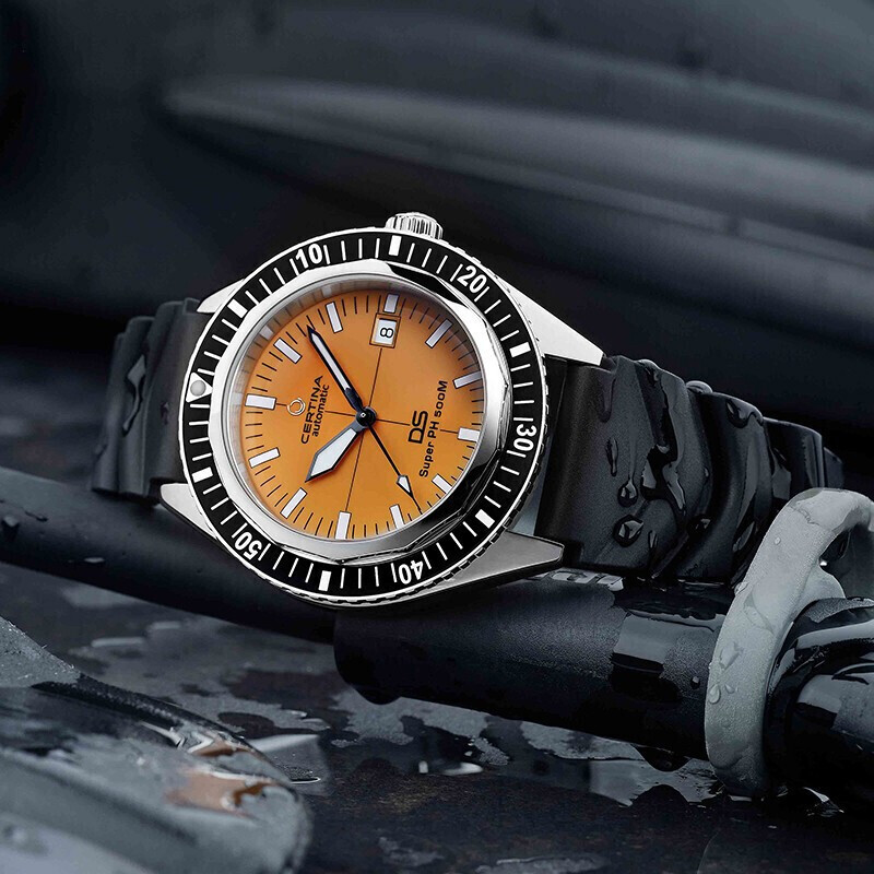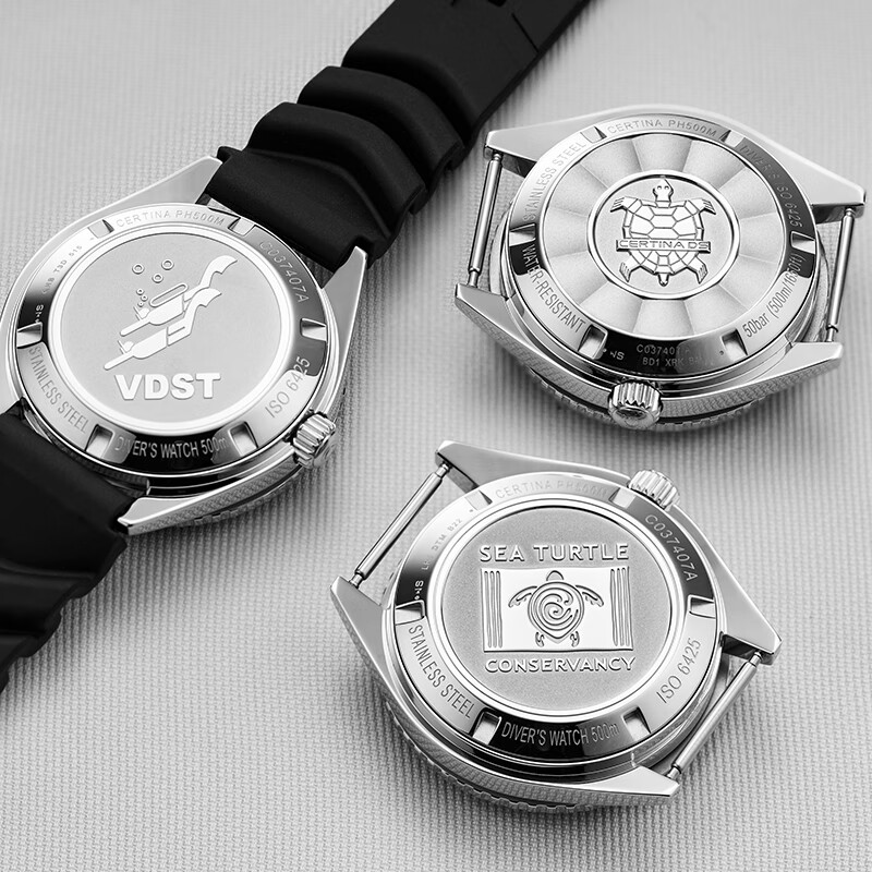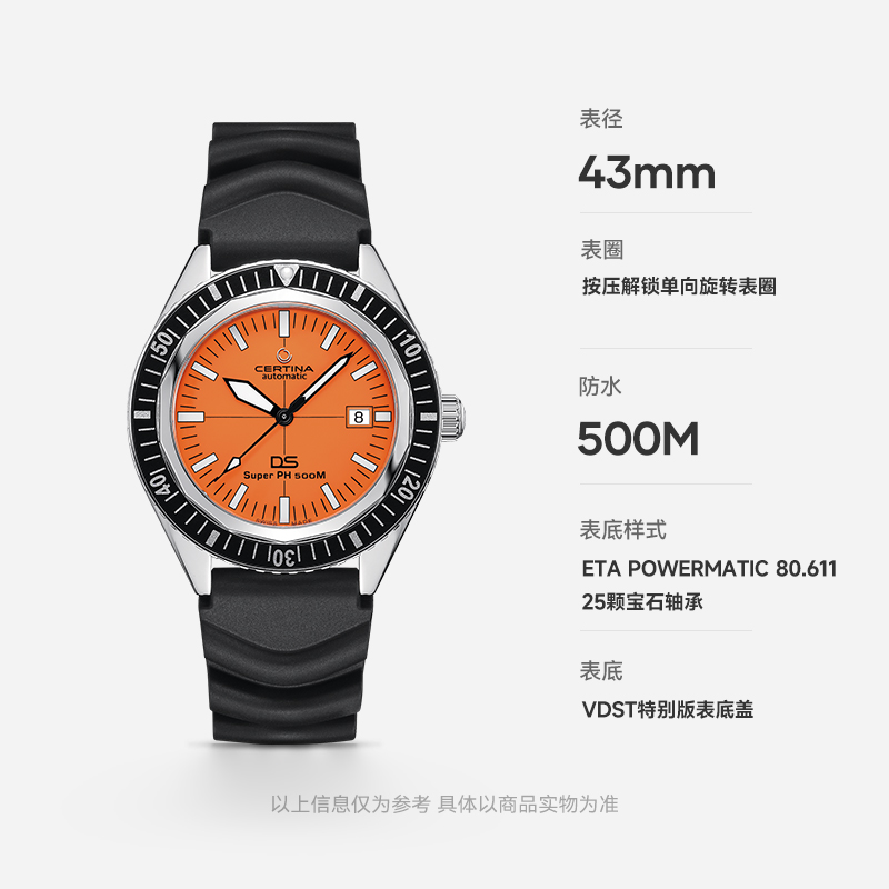 CERTINA 雪铁纳 SUPER PH500M系列 VDST特别版 自动机械男表,德国潜水协会合作款,VDST特别版表底盖,表镜为单面防炫目处理蓝宝石玻璃;43mm大尺寸表壳,表壳厚度14.95mm,整体硬朗帅气。SUPER-LUMINOVA夜光涂层,即使在夜晚也能轻松掌握时间。旋入式表冠设计,防水性能可达50巴(500米)。按压解锁单向旋转表圈,更专业、更安全。NIVACHRON抗磁性摆轮游丝,ETA POWERMATIC 80.611机芯,抗磁性提升10至20倍,不惧温差,不易老化。