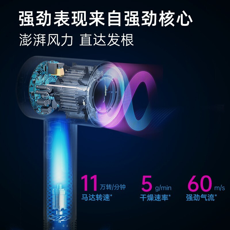 追觅SHPH52吹风机搭载了追觅第二代高速无刷马达,达到了11万转/分钟的转速,是普通吹风机的6倍;60m/s的超高风速让头发水分在较低温度也可以很快蒸发掉,达到快速干发、不伤头发的目的。其搭载的NTC智能恒温护发功能,可以实现每秒100次温度检测,实时调整,保证出风口温度恒定在57℃;同时冷热循环风功能,通过冷热风交替吹出,减少热量堆积,避免过热损伤,速干不出汗帮助收缩毛鳞片,焕亮秀发。SHPH52内置负离子发射器,通过高速气流喷射出千万级负离子,中和发丝表面正电荷,让秀发长久柔顺不毛躁。追觅SHPH52吹风机拥有多项降噪设计的黑科技,例如60次叶轮和电磁设计优化、0.3mg叶轮动平衡,让用户在享受凹造型的过程中不被噪音所打扰。