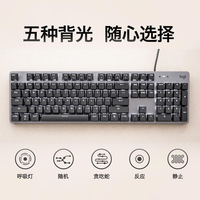 K845机械键盘轴体为CHERRY红轴,线性轴体,手感轻盈,长时间使用别易累。采用优质铝制面板及磨砂工艺,集颜值耐用于一身。悬浮高键帽,弧形布局,打字更舒适。透光模制字符不会褪色或脱落。五种背光灯效,组合多媒体功能键。