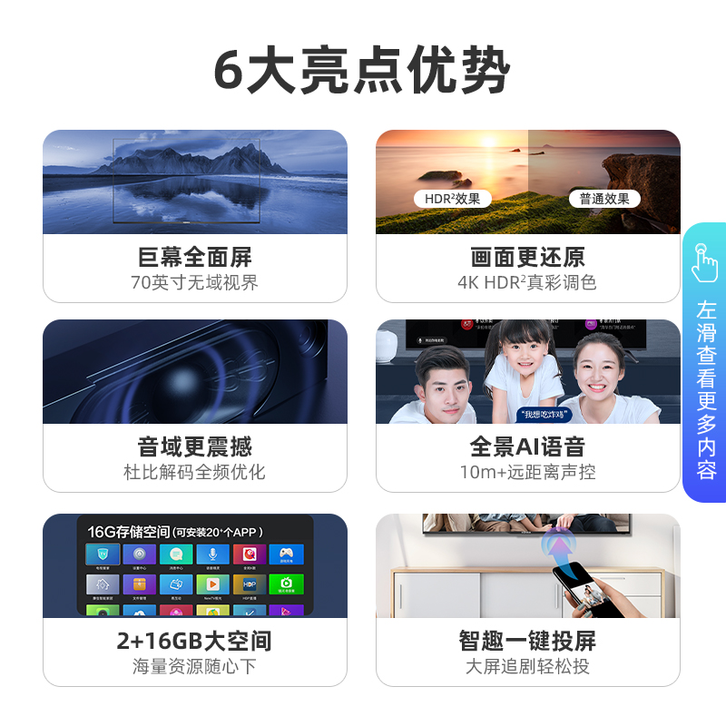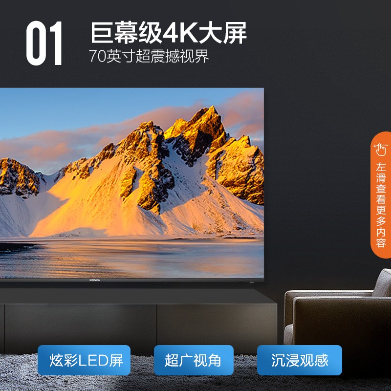 康佳D6S系列液晶电视采用屏幕贴合技术,隐去三边包裹,打造近乎无边的全面屏。配备多项画质优化技术,支持杜比解码音效,搭载华为海思处理器,拥有2GB内存+16GB存储空间,支持AI语音操控,内置易柚YIUI,采用超窄边框设计,接口包括HDMI*2、USB2.0*2等。