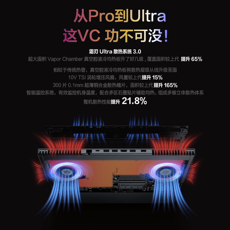 其他方面,R9000K 2021款搭载了第三代霜刃Ultra散热系统,全区超大面积VC液冷均热板,多区石墨烯辅助均热,让热量无处可藏,为新一代平台保驾护航;84mm大直径涡轮风扇配合全区进出风设计,散热效率更高。搭载全新的WiFi6标准双频无线网卡,最高速度可达2.4Gbps,2.4倍于千兆有线网络,完整支持MU-MIMO与OFDMA技术。80Wh大容量电池,配备300W高功率适配器,30分钟充满50%,一小时即可充至80%以上,且支持100W PD充电。搭载两个Harman超线性扬声器,Nahimic提供身临其境的听觉体验。接口方面,3*USB-A 3.2 Gen 1,2*USB-C(DP1.4、USB 3.2 Gen2,尾部C口支持PD),1*USB-C 3.2 Gen1,千兆RJ45接口,3.5mm音频接口,1*HDMI 2.1接口。
