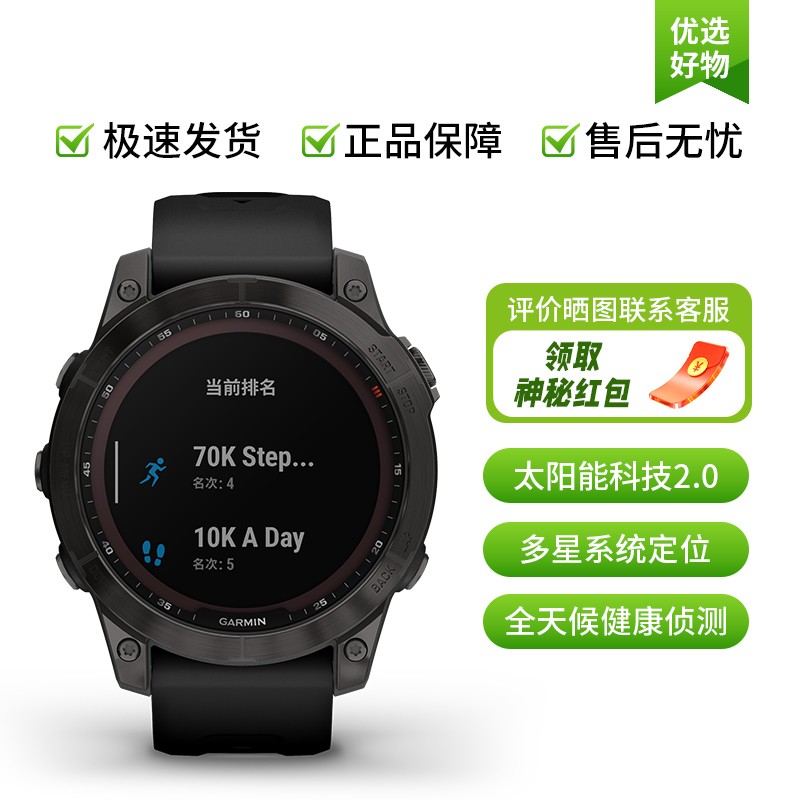 太阳能科技2.0 续航再升级,重构太阳能面板,太阳能充电效率翻倍,结合A!智能电源管理,高效控制腕表续航力。经典五键+全新触屏操作,按键操作安全可靠,触控屏操作方便快捷,户外运动及日常生活都实用。全新搜星芯片,功耗更低,支持五种全球卫星系统和双频(L1+L5)搜星频段,能同时搜索多重卫星系统并且自动优选合适组合,快速定位与减少多重信号干扰。LED照明灯,户外安全多一重保障,白、红两种光源,可设置多种闪烁方式,长闪、短闪、SOS信号等。新增体力图表与路线点距离资讯,管理整场赛事的体力,可预先规划路线上的检查点、补给点等。多场景运动模式。等待你的挑战,支持跑步、骑行、游泳、登山、徒步、HIIT、滑雪、划船、攀岩等40多种运动模式,全程记录运动及生理数据,满足不同运动需求。