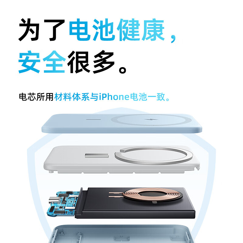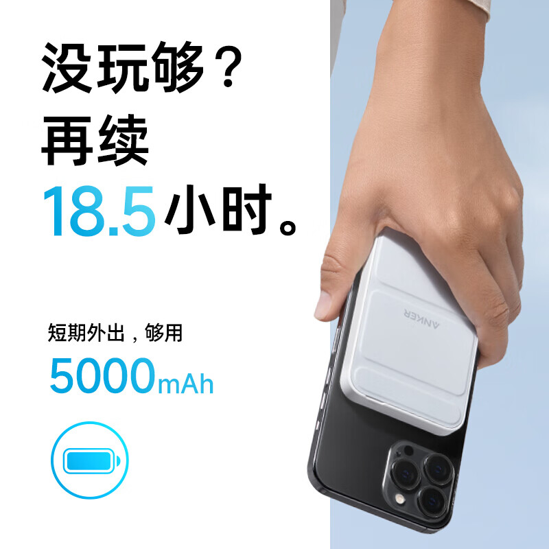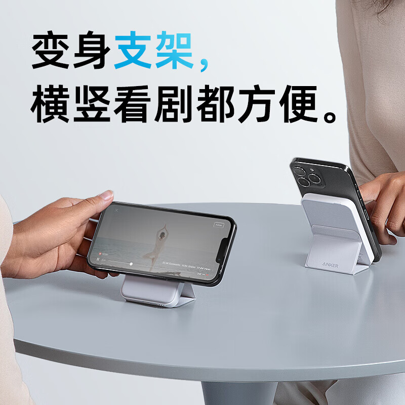 安克 MagGo 磁吸无线充电宝 容量为5000mAh,此款产品将充电宝/磁吸无线充/手机支架三合一,自带可折疊支架,看剧刷视频更方便,12W自充,2h 10min可充满自身,多重安全保护,使用更放心。