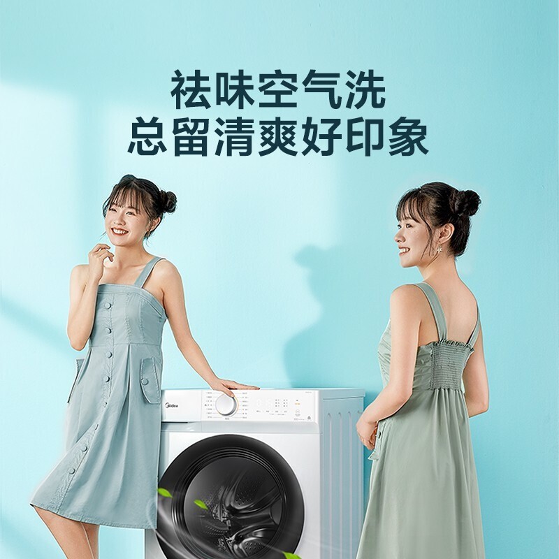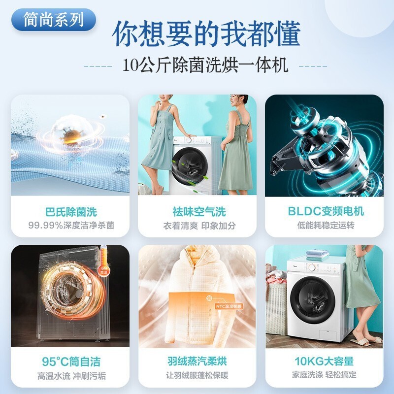 Midea 美的 MD100V11D 10公斤 洗烘一体机 ,19年8月上市,10公斤大容量,主打纤薄设计,有效节省厨卫空间。1400转BLDC电机,拥有多种洗涤程序,巴氏除菌,祛味空气洗减少水洗次数,呵护衣物纤维和色泽。烘干容量7KG,羽绒服低温烘干,自编程洗涤,95℃筒自洁,洗净比1.05,产品尺寸595*600*850mm。