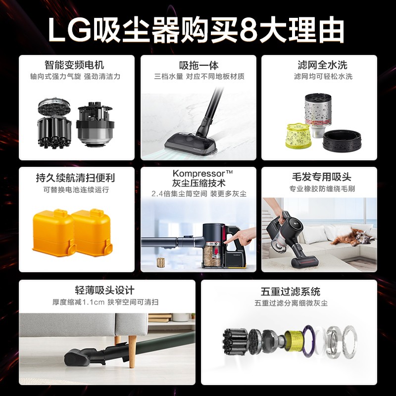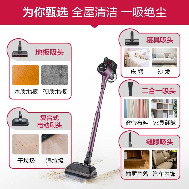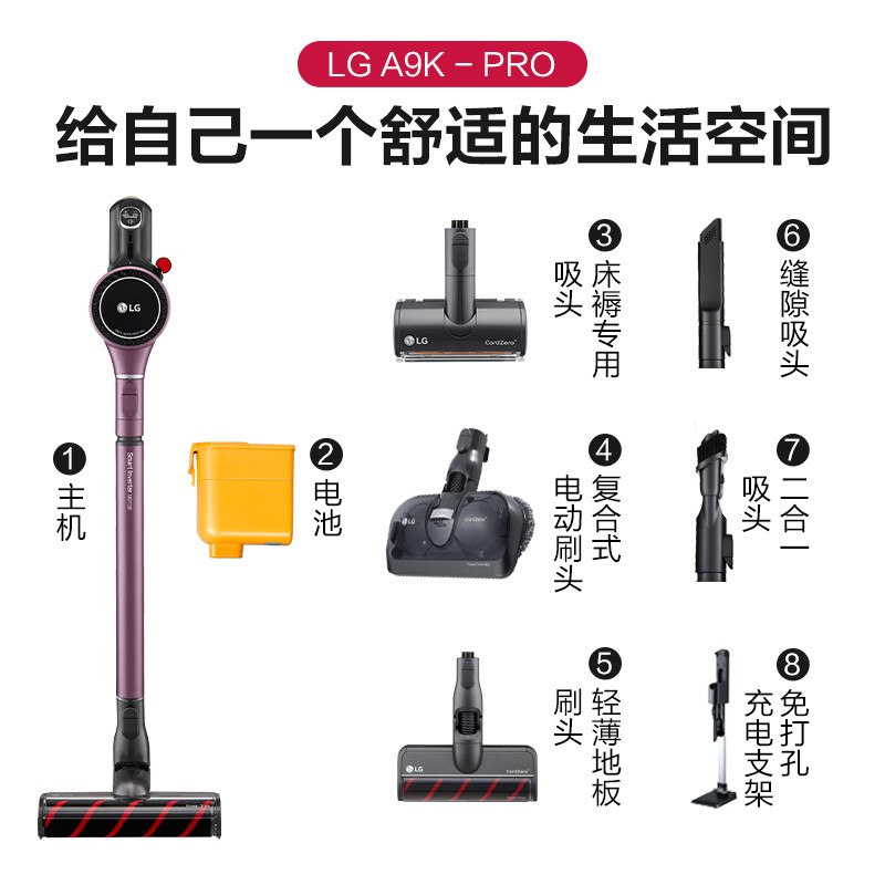 LG这款A9K PRO手持式吸尘器,其属于A9K系列的入门升级款产品,该款产品在“2个床褥、1个地板以及1个床褥”4款吸头的基础上增添了“复合式电动刷头”,为本款产品增添了拖地的功能,吸拖一体轻松实现更强的清洁能力。对于日常常见的清洁项目来说是完全足够的。此外,产品人性的加入换电设计,单电池最长使用续航为60分钟,如无法满足用户日常使用,可考虑后续再进行电池选配,轻松延长使用续航。