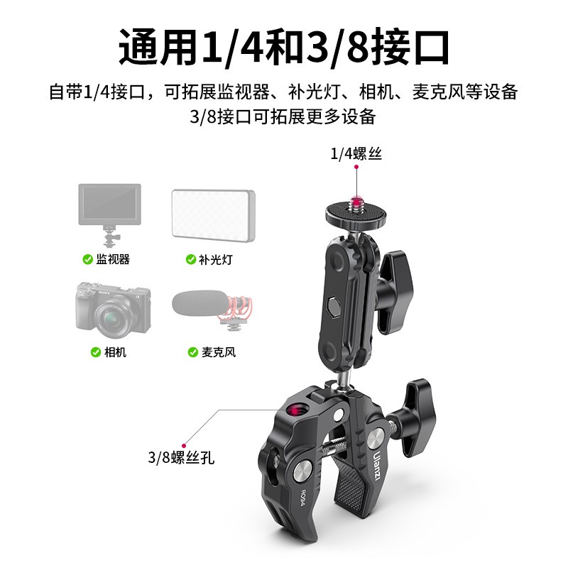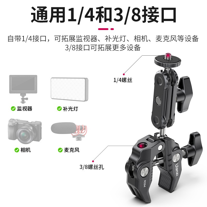 夹嘴处采用嵌入式硅胶垫,防滑更稳固。球头牙纹设计,锁得更紧。360°旋转球头,双边球头可任意调节方向,另外拓展一个3/8螺丝孔可连接更多设备使用。自带1/4接口,可拓展监视器、补光灯、相机、麦克风等设备,3/8接口可拓展更多设备。