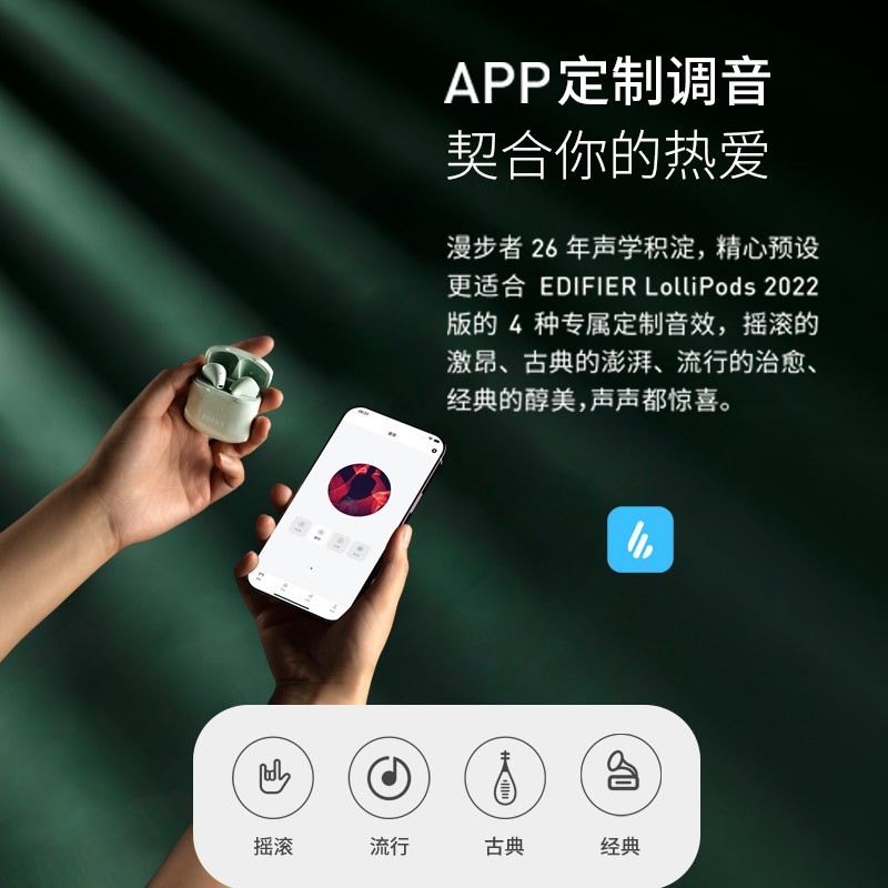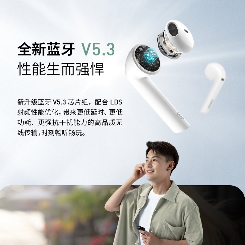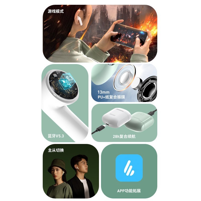 这款耳机升级蓝牙V5.3芯片组,配合LDS射频性能优化,带来更低延迟、更低功耗、更强抗干扰能力的高品质无线传输。支持APP定制调音。特选13mm大尺寸PU+纸复合振膜,独特导声架构方案,动态和瞬态响应快速精准,低频回弹饱满、高中频纯正通透,震撼大声场也能呈现丰富细节。游戏模式下延迟不高于65ms。双MIC通话降噪。升级Type-C接口,单次续航7小时,配合充电仓使用总续航达28小时。半入耳佩戴,支持主从切换。首发三种配色(黑、白、绿)。