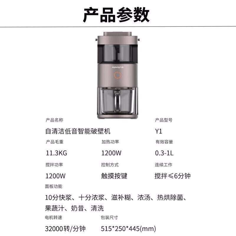 九阳(Joyoung)这款型号为Y1的破壁料理机,主打卖点为“不用手洗”,其具备自动清洗功能,在使用完毕后进行自动清洗,清洗完毕之后又可以进行热烘除菌。整个机身采用了创新式设计,1L的外置式水箱、独立的接浆杯、全透明式研磨腔,给人很强烈的科技感。采用了隐藏触摸显示屏设计,所有操作都在玻璃面板上进行。带有10分快浆、十分浓浆、滋补糊、浓汤、果蔬汁、奶昔、磨粉7种制作方式,另外还增加了热烘除菌和清洗两个快捷按键。搅拌腔内使用了日本进口食品级龙牙刀,刀身还有独特的开孔设计,能够加速食材的循环切割次数,在被称为破壁机界"核武器"的直流无刷电机配合下,最多能达到99%的破壁率。