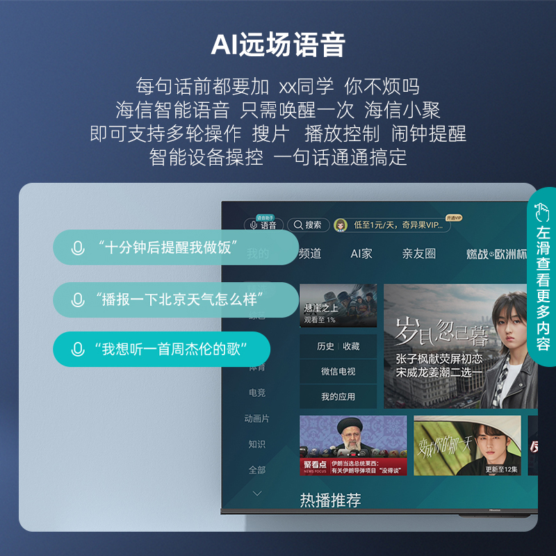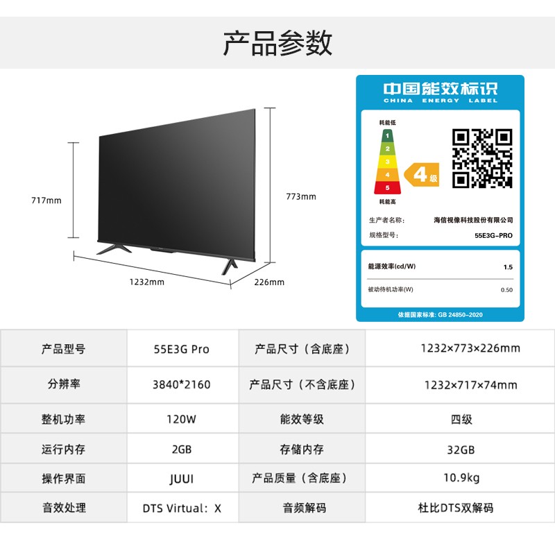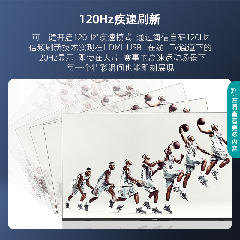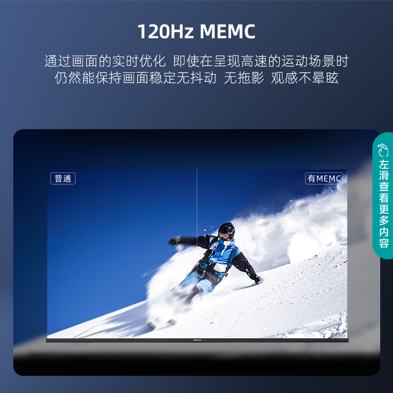 1.外观:全新超薄一体化机身,搭配悬浮全面屛设计,给您带来更广的视野,更沉浸的观影体验哦。 2.画质:配备MEMC运动补偿技术,保证画面流畅不抖动,AI音画智能场景识别,搭载4K HDR高动态范围解码,为您展现更高级别的画面效果。 3.音质:杜比DTS双解码与DTS音效处理,让声音更加动听,给您带来影院级视听体验感受。 4.配置:64位强劲芯片搭载2+32GB超大内存,运行更流畅,让您畅快体验各类应用,杜绝卡顿。 5.智能:采用全新VIDAA AI智慧系统,实现免遥控、100+场景服务、全天候的AI声控功能,直接对话,为您带来便捷智能新生活。