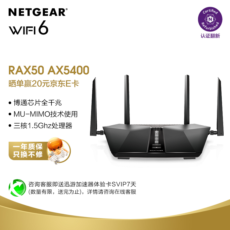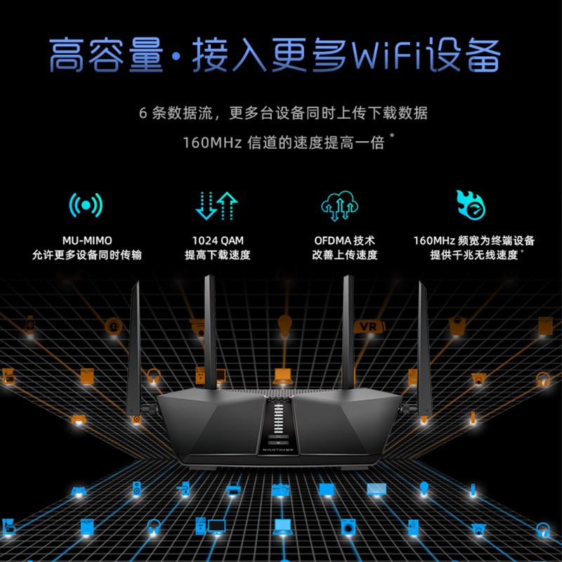 4根可拆卸、可替换7dbi高增益天线设计,搭配WiFi放大增强PA/LNA模块,提高无线传输性能。6条数据流、更多台设备同时上传下载数据,160MHz信道速度提高一倍。OFDMA技术显著提高网络容量,2.4GHz频段提供高达600Mbps传输速率、5GHz频段提供4800Mbps传输速率;具备5个千兆网口。