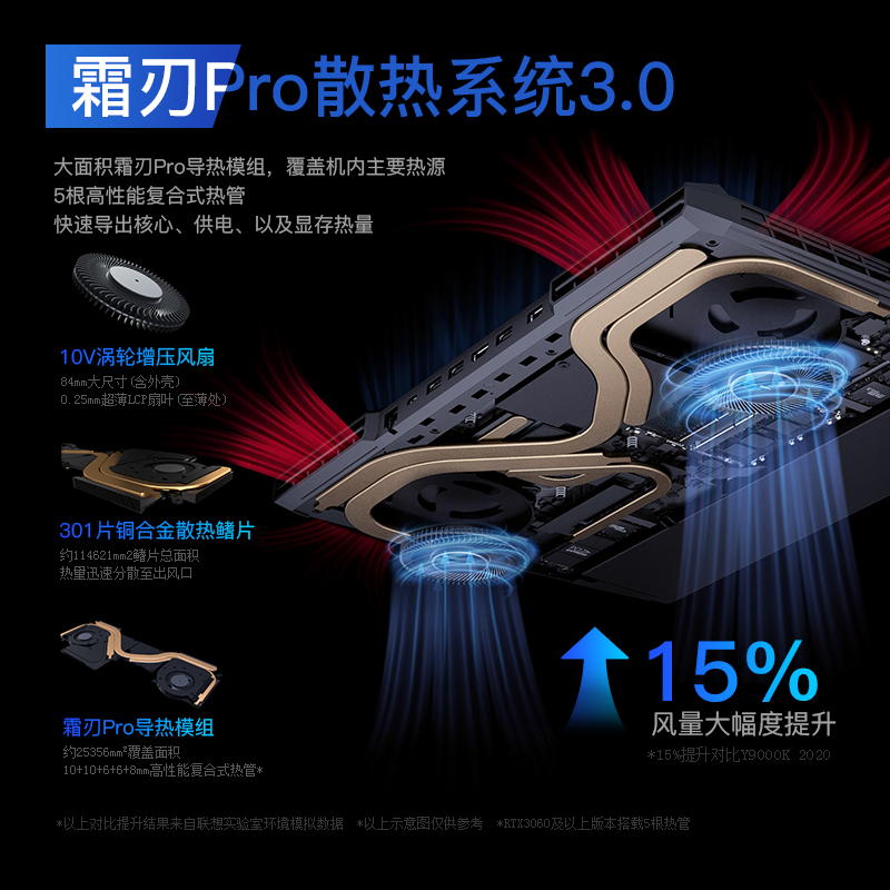 其他方面,R9000P 2021款采用了第三代霜刃散热系统,拥有全覆盖导热模组、8mm高性能复合式热管、84mm大直径涡轮风扇,配合智能控温系统,散热更高效。搭载全新的WiFi6标准双频无线网卡,最高速度可达2.4Gbps,2.4倍于千兆有线网络,完整支持MU-MIMO与OFDMA技术。80Wh大容量电池,配备300W高功率适配器,30分钟充满50%,一小时即可充至80%以上,且支持100W PD充电。搭载左右对称的扬声器,支持全景环绕。接口方面,具备4*USB-A3.2Gen1,2*USB-C(DP1.4、USB3.2Gen2,尾部C口支持PD),千兆RJ45接口,3.5mm音频接口,1*HDMI2.1接口。