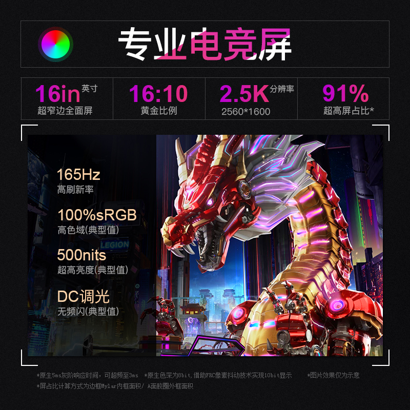 拯救者R9000P 2021款,是拯救者面向电竞玩家推出的一款专业电竞本,具备炫酷外观与强悍实力。外观方面,采用大“Y”灯、A/D双面金属机身的搭配,充分彰显电竞玩家身份。16英寸四边窄边框全面屏,分辨率为2560*1600,刷新率为165Hz,色域为100%sRGB,亮度为500nits,支持DC调光、G-Sync和FreeSync。厚度约21.7~26.85mm,重量约2.58Kg。
