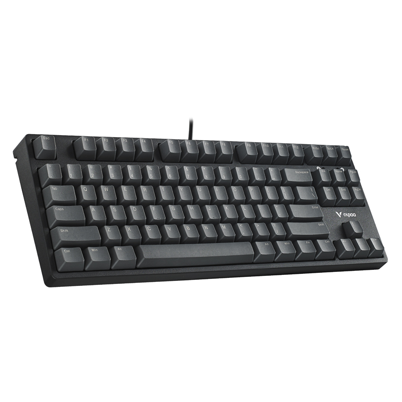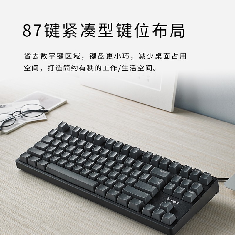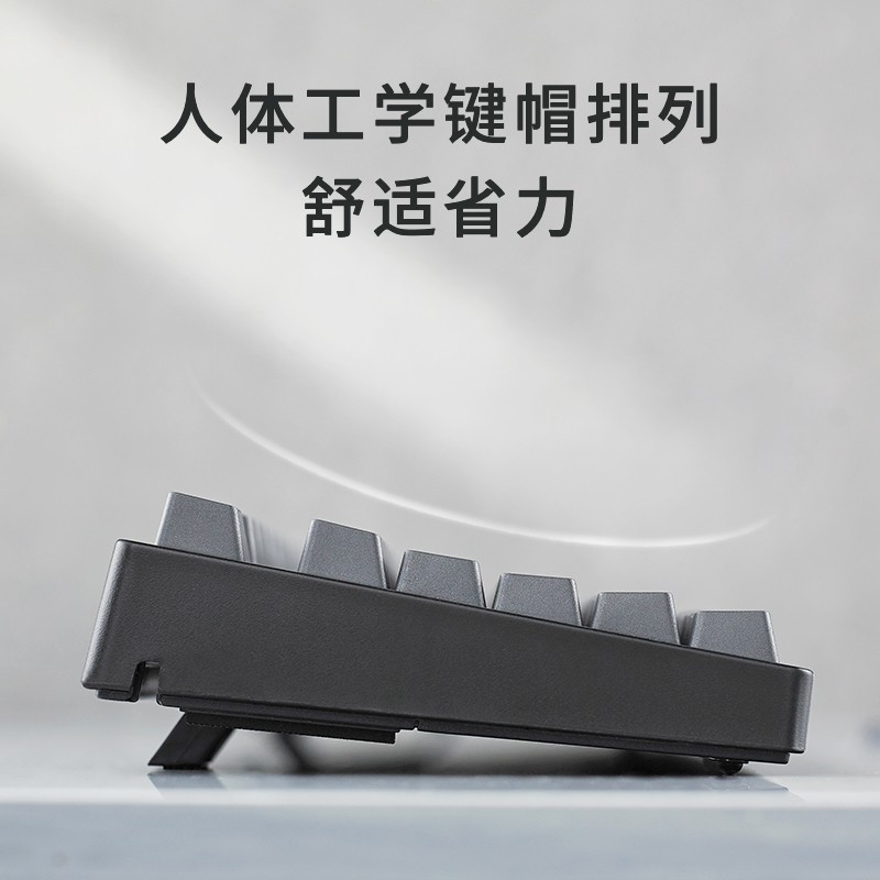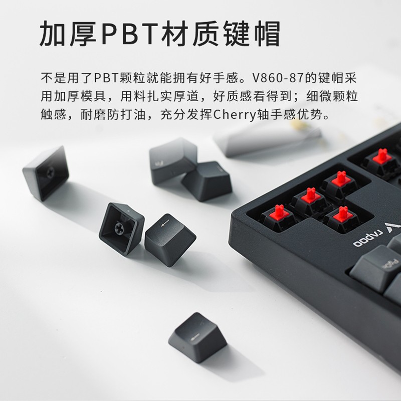 雷柏V860 机械键盘搭载樱桃Cherry MX轴,拥有5000万次寿命,黄金触点,4款手感轴体。采用的PBT材质的键帽,用料扎实,拥有出色的质感,耐磨防打油。由上至下,6排键帽共4阶排列,长时间打字更加舒适省力。