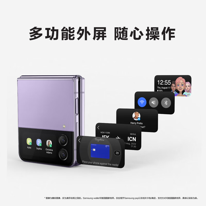 三星Galaxy Z Flip4的整体设计与系列一脉相承,“翻盖”式的掌心折叠带来了精致与小巧,闭合时仅有手掌般大小,放在口袋里刚好合适,非常便于携带。背板配备了康宁大猩猩 Victus+玻璃,边框采用坚固的铝合金框予以加固,确保手机安全,提供幽紫秘境、哥特太空、繁樱花园和蓝海假日4个配色,整机展开薄约6.9mm,重263g。