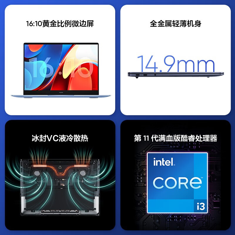 realme Book Air采用全金属机身,CNC切割工艺,有冰蓝棋盘和苍穹灰两种配色,14.9mm纤薄设计,1.36kg重量。
