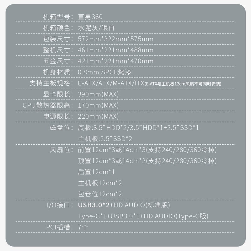 工业风个性之选,水泥灰搭配砖状通风孔设计,更显气质。 上下通风,散热更佳。PUB智能磁吸,即取即装,面板配置12/14cm风扇位刻度,直锁不费心。智能磁吸,安装姿努四步解锁。7个PCIE插槽,突破空间局限,30系厚显卡也能轻松装。可选配显卡支架,实现竖装3槽显卡,多样玩法丰富装机日常。顶置405mm加长冷排安装位,安装再无顾忌,顶置冷排热气上流,散热效果自然事半功倍。4mm滑轨玻璃侧透,把机箱变成光影艺术装置。多硬盘位支持:底板3.5"HDD*2/3.5"HDD*1+2.5"SSD*1;主机板:2.5"SSD*2。风扇位:前置12cm*3或14cm*3(支持240/280/360冷排);顶置12cm*3或14cm*2(支持240/280/360冷排);后置12cm*1;主机板12cm*2;包仓位12cm*2。